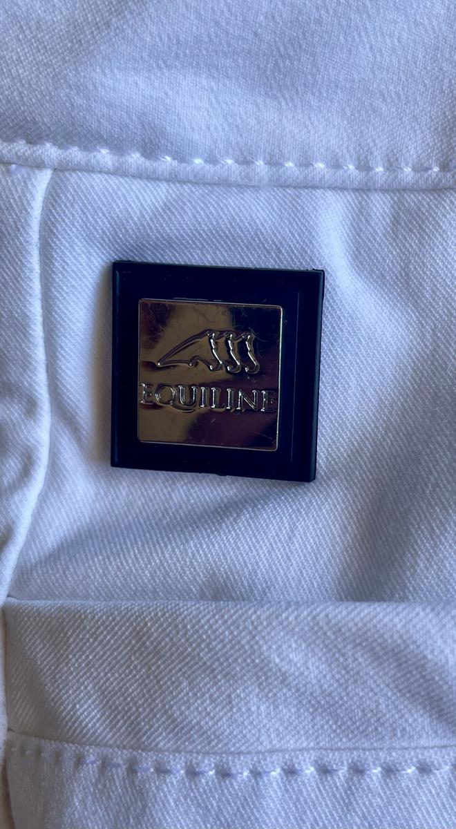 Pantalon concours, blanc, de marque Equiline , utilisé 3 fois, très bon état , légères traces noires . Pas de grip. Taille 36