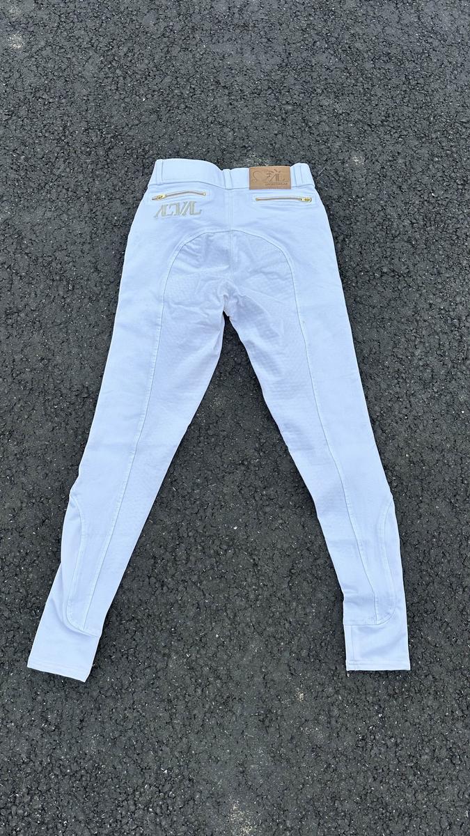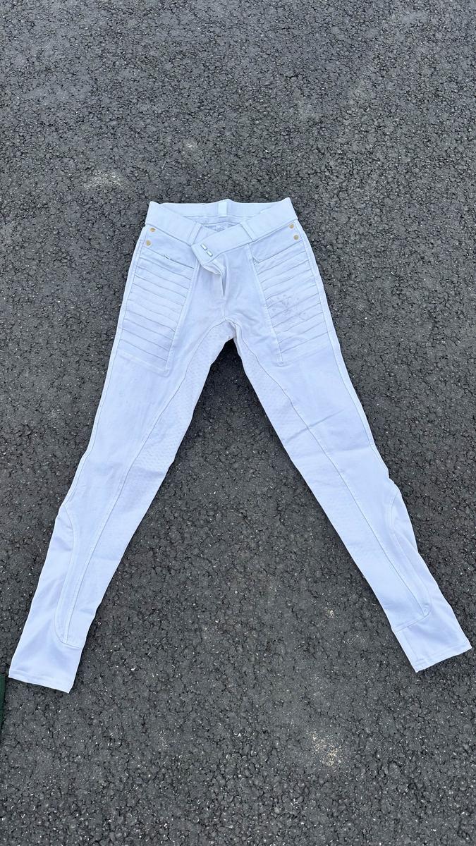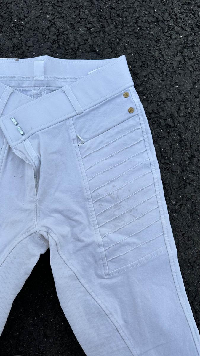 Bonjour, Je mets en vente mon pantalon blanc porté uniquement 2x (en concours. Taille 34/36. Petite tache sur une poche avant mais s’enlève avec un peu d’huile de coude ou une maman qui sait faire