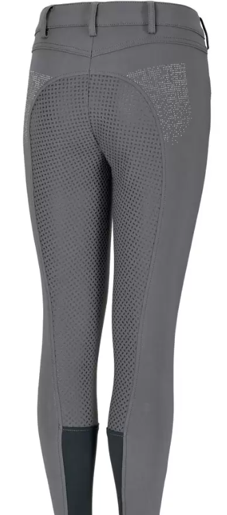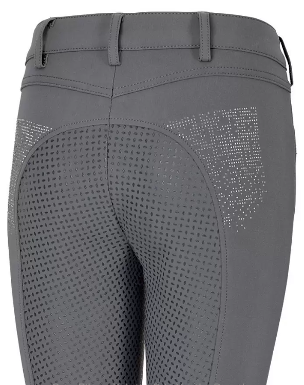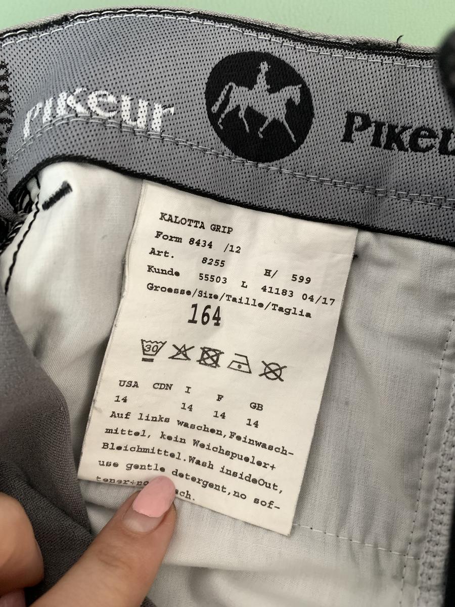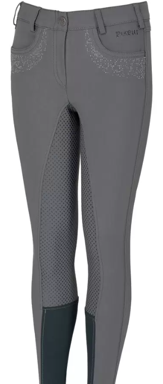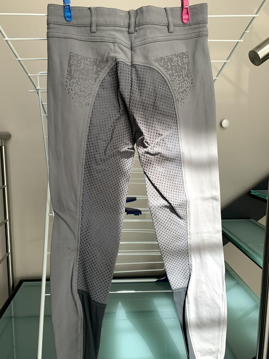 Pantalon Kalotta Grip Junior gris, taille 164 (14 ans). Taille mi-haute, siège antidérapant en silicone, ouverture de cheville extensible et des poches avant. Paillettes cloutées sur les poches arrière et avant. Cause de la vente : trop petit. Prix négociable