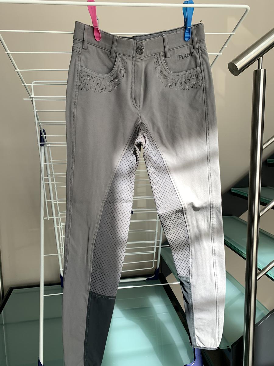 Pantalon Kalotta Grip Junior gris, taille 164 (14 ans). Taille mi-haute, siège antidérapant en silicone, ouverture de cheville extensible et des poches avant. Paillettes cloutées sur les poches arrière et avant. Cause de la vente : trop petit. Prix négociable