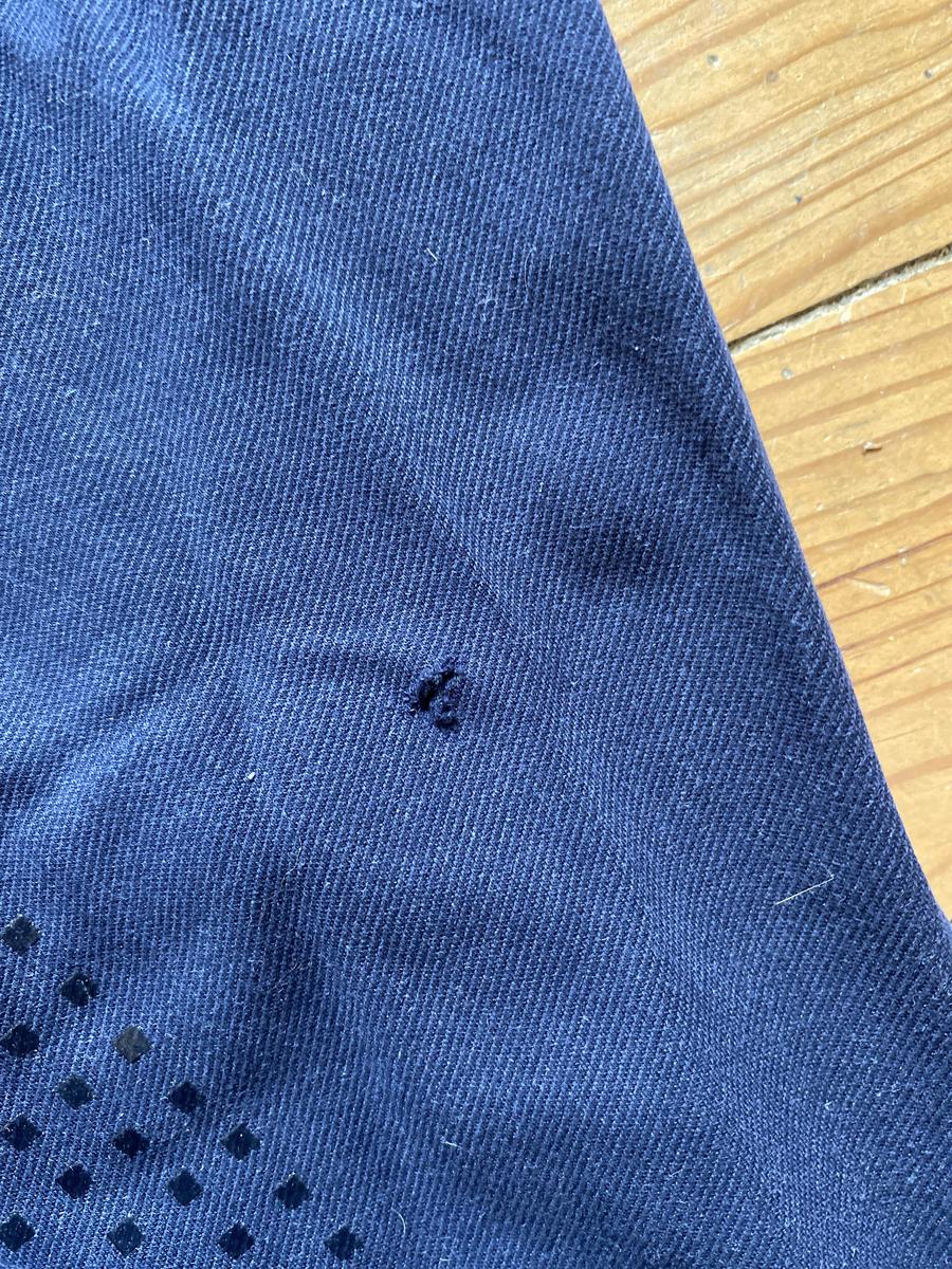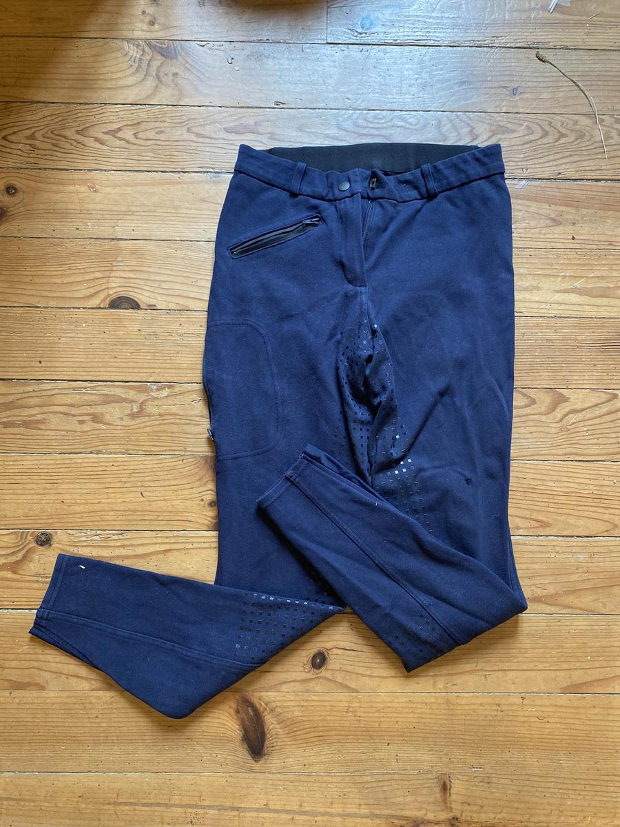 pantalon bleu marine, avec des grippes et deux poches dont une pour le téléphone. Utilisait que quelques fois, mais présente un trou au niveau de genou facilement réparable