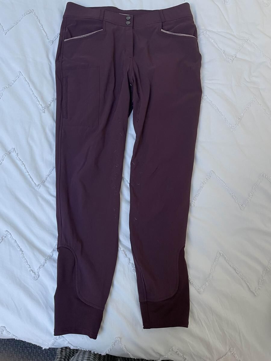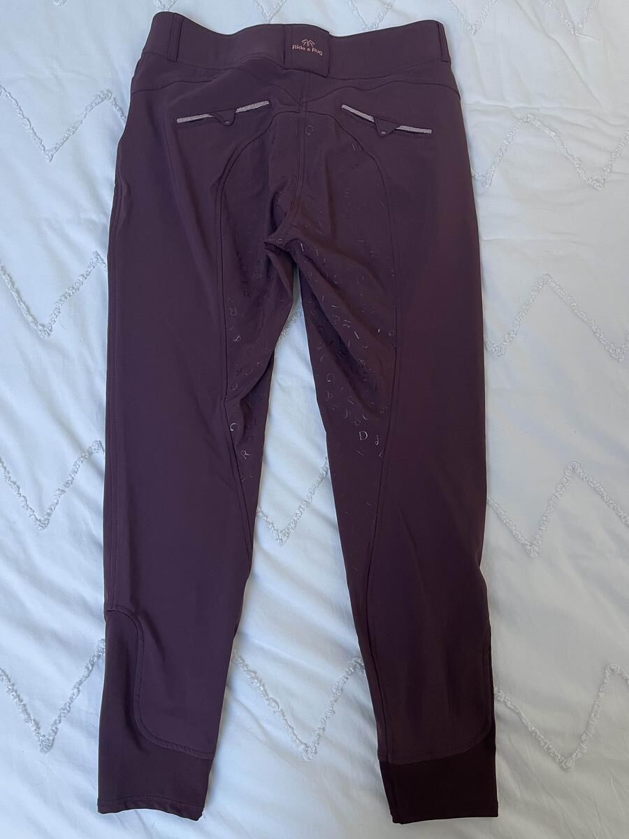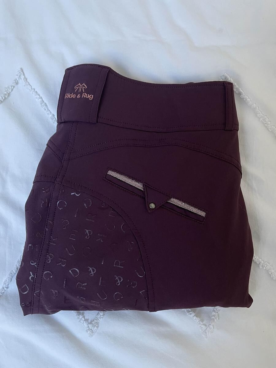 Pantalon d’équitation full grip / fond intégral siliconé Breanne Ride and Rug taille L. COULEUR : PRUNE Porté seulement 2 / 3 fois (acheté 100€) car j’ai perdu beaucoup de poids. Petits plus : c’est un taille haute ce qui le rend confortable. Il a de jolis liserés pailletés au niveau de chaque poche. Le full grip permet une bonne adhérence à la selle. Voici le lien du site pour des photos porté : https://rideandrug.com/fr/products/breanne-full-grip-breeches?variant=55010793816389