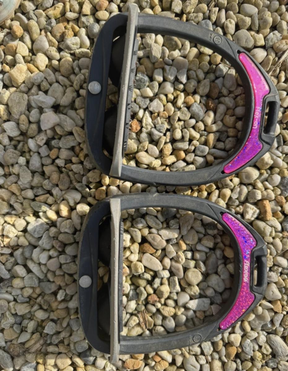 Étriers flexon gris et rose taille adulte en bon état juste qlqs traces de rayures/rouille sur l’arrière du plancher (voir photo).