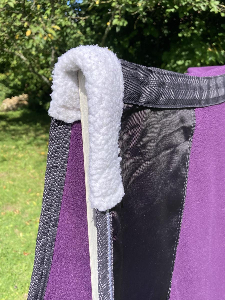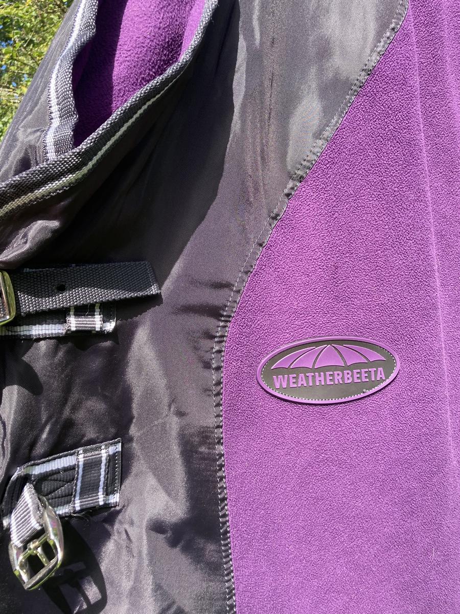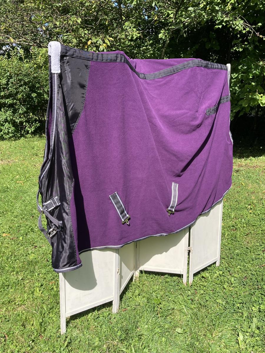 Chemise polaire Weatherbeeta taille 6.3 (140) violette. Excellent état (n’a été qu’essayée sur un cheval), 2 sangles ventrales réglables, 2 sangles réglables au poitrail ainsi qu’un scratch, une corde de queue.
