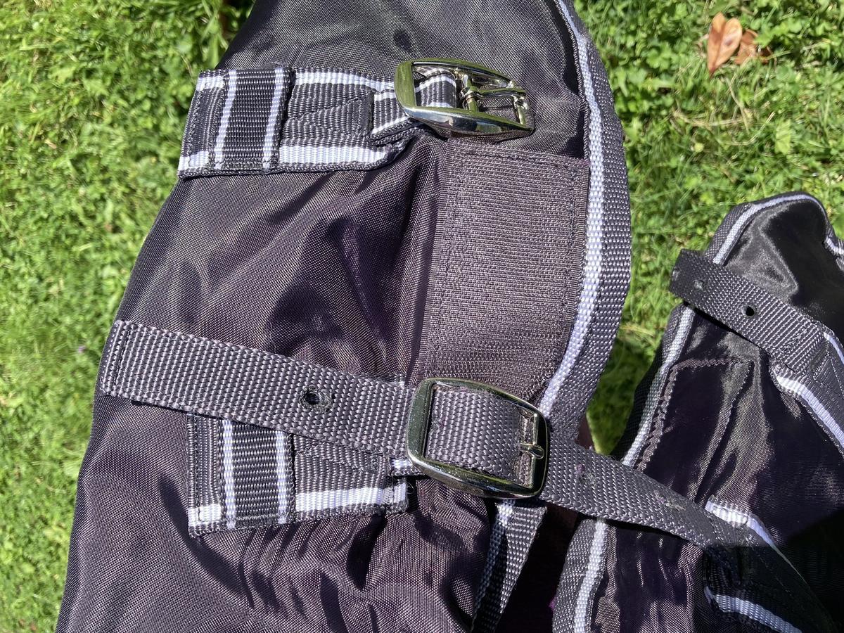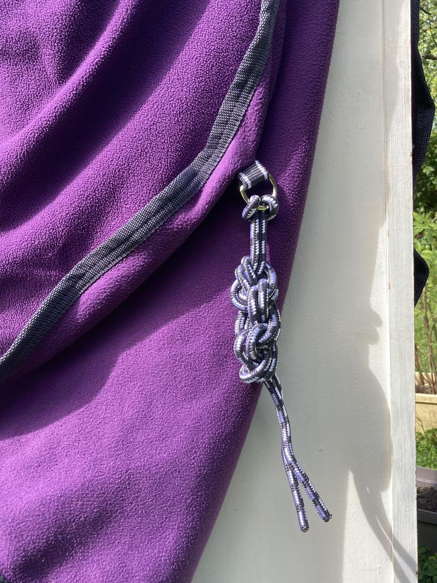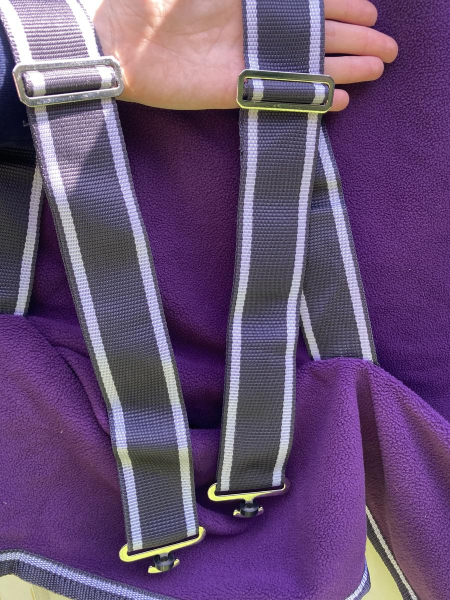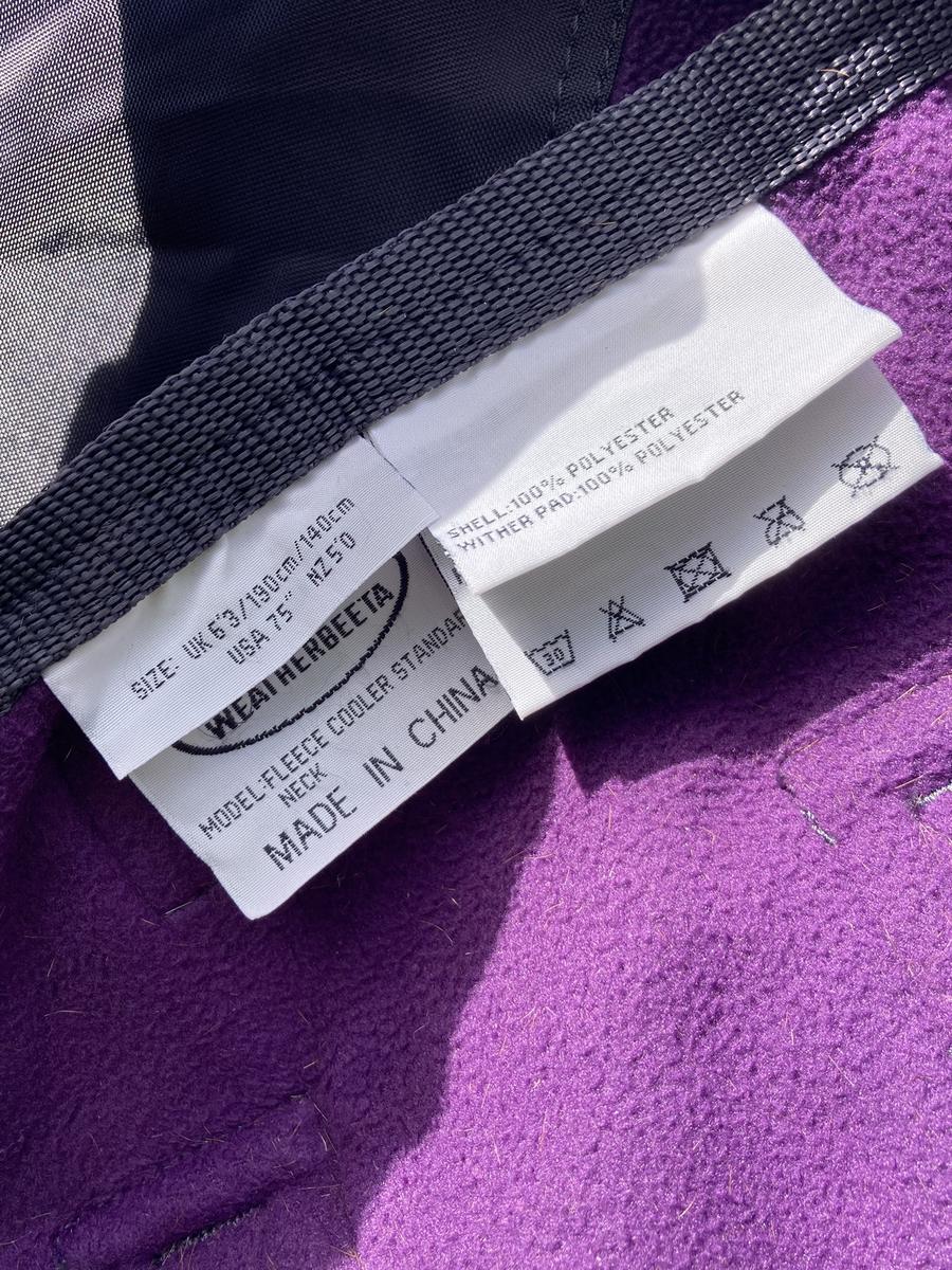 Chemise polaire Weatherbeeta taille 6.3 (140) violette. Excellent état (n’a été qu’essayée sur un cheval), 2 sangles ventrales réglables, 2 sangles réglables au poitrail ainsi qu’un scratch, une corde de queue.