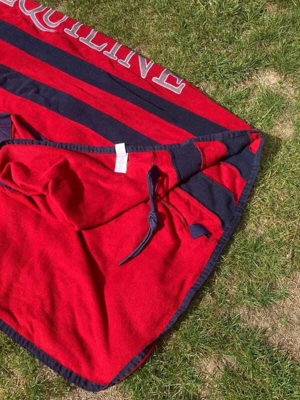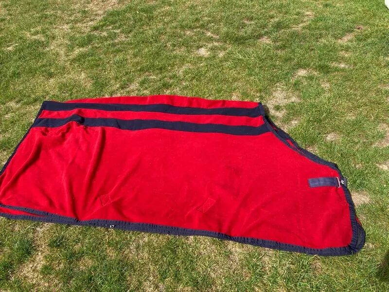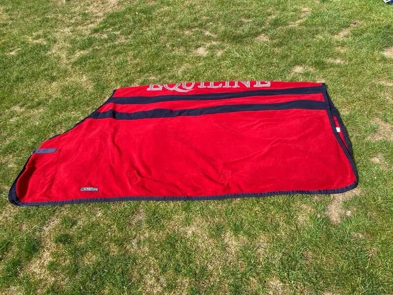 Couverture polaire de la marque Equiline, en taille L (correspondant à un 145 cm / 6'6). D'un rouge éclatant avec ses finitions bleu marine et le logo Equiline brodé, elle est idéale pour maintenir votre cheval au chaud après l'effort ou par temps frais. Elle est équipée d'une fermeture pratique à l'avant et permet l'ajout de sangles ventrales si besoin (non incluses).
