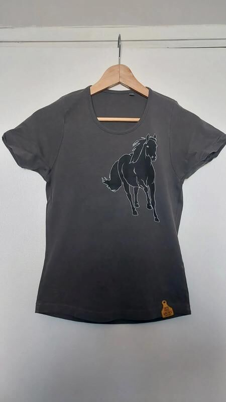 T-shirt brun/gris avec un cheval à l'avant, et une inscription "Très à cheval" au dos. Taille S. Neuf.