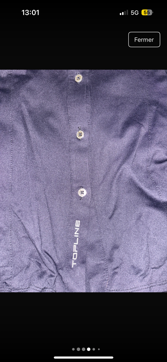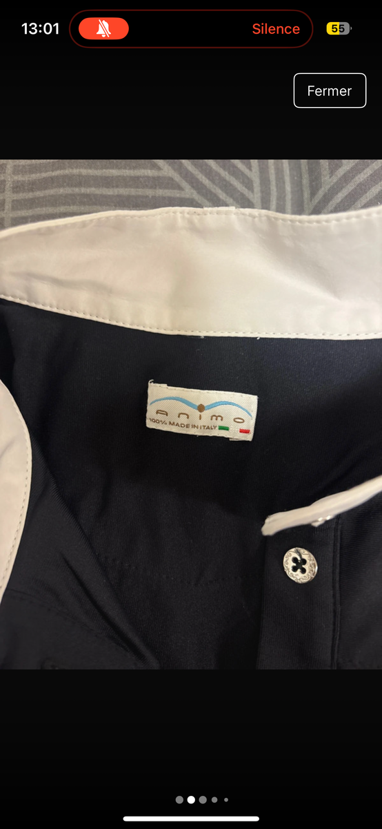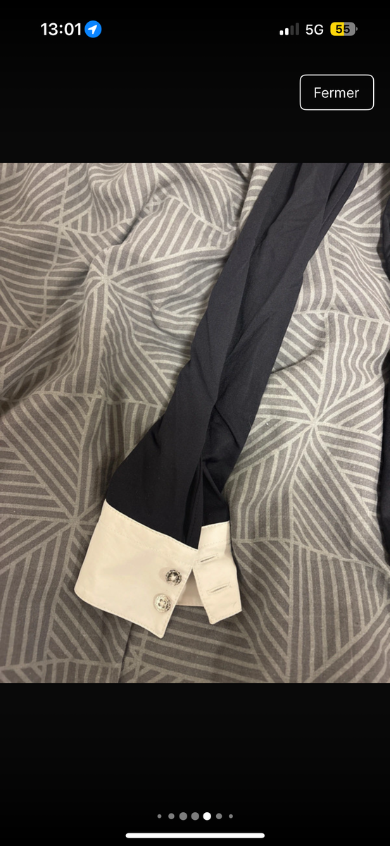 Magnifique polo de concours pour l‘équitation, manches longues, couleur noire, col et manches de couleur blanche, taille M (38), bouton de rechange, porté 2 fois. Acheté 150€.