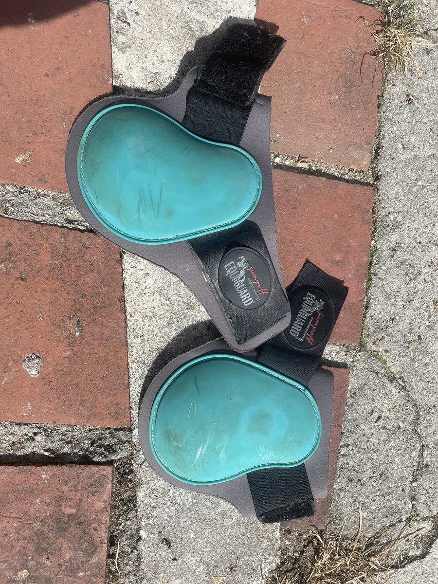 Protège boulet bleu taille cheval de la marque Equiguard. Bon état pour l'extérieur qui a quelques tâches, mais les scratch et l'intérieur sont en excellent état.