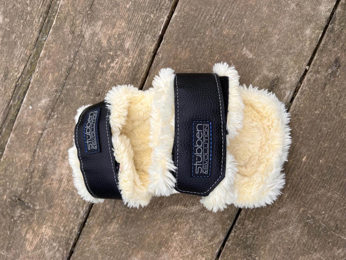 Paire de protège boulets noirs, doublés fourrure teddy, taille L, gamme Freeflex de Stübben, bon état.