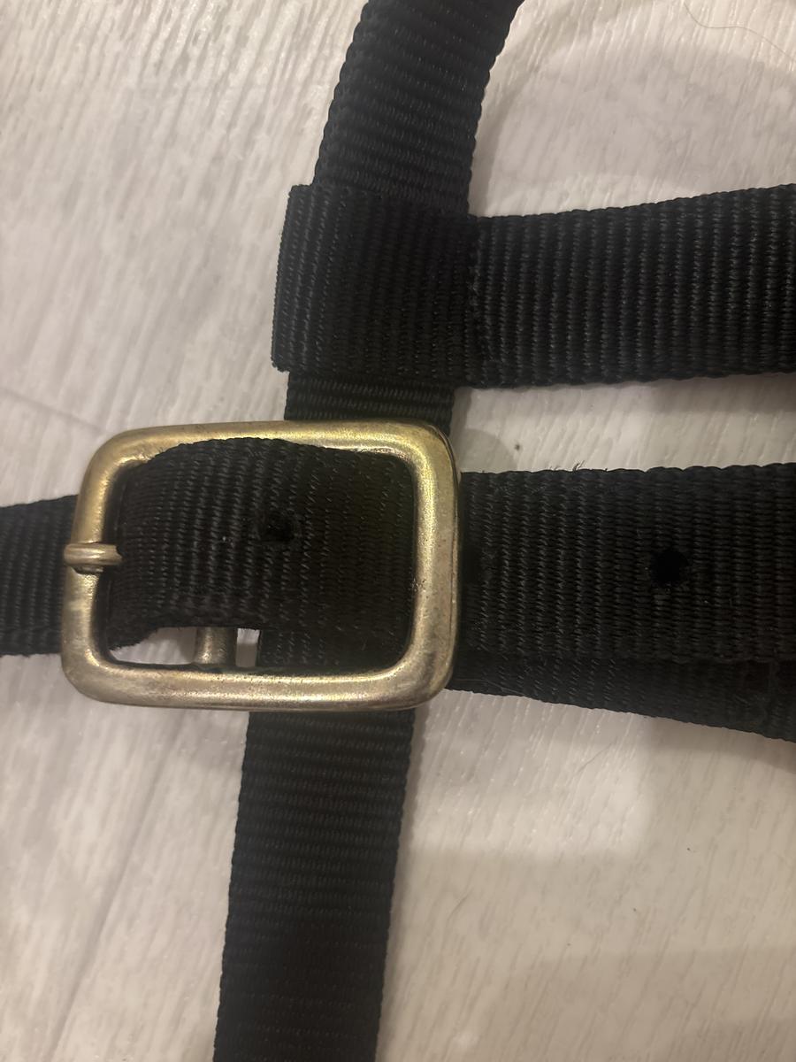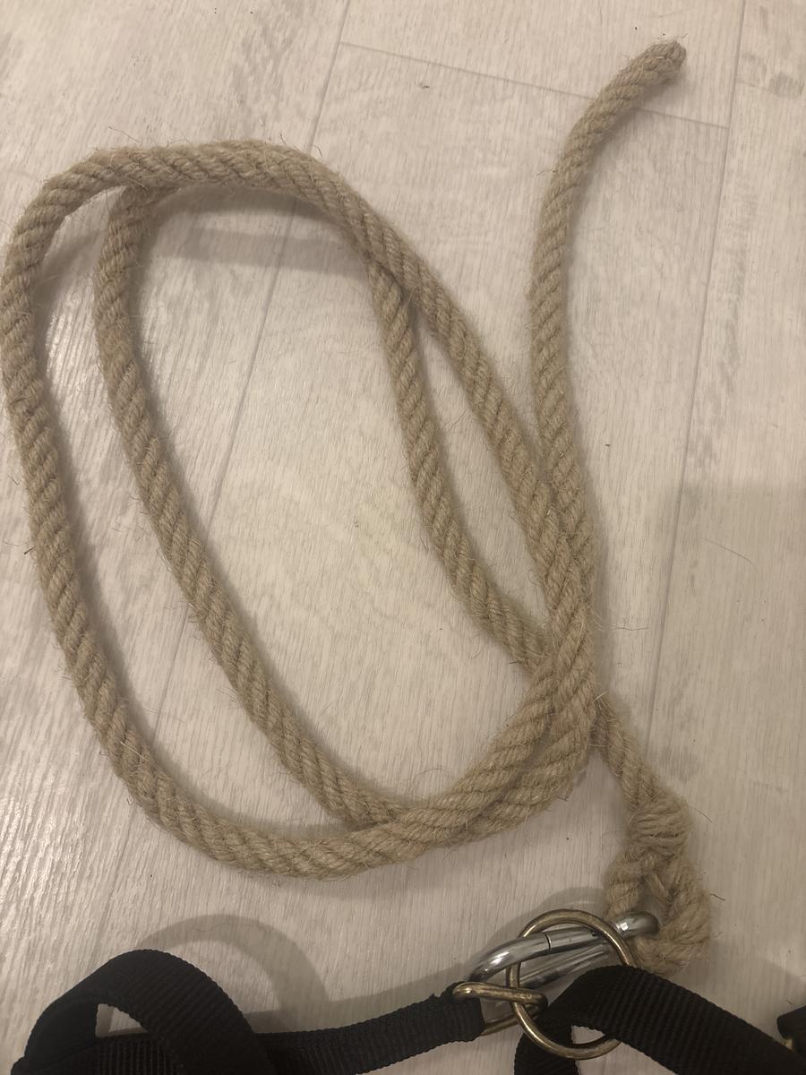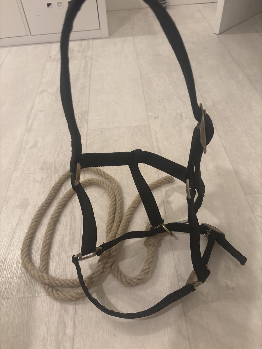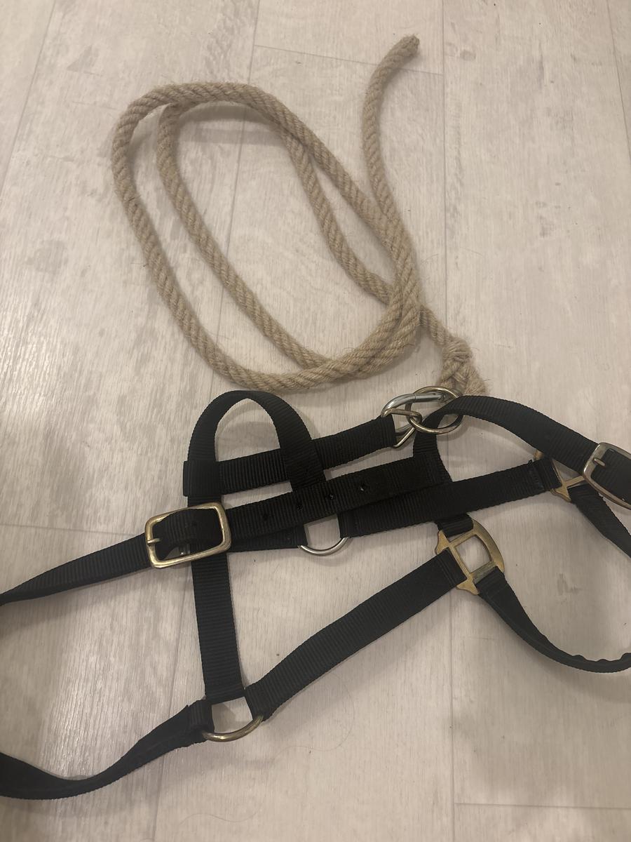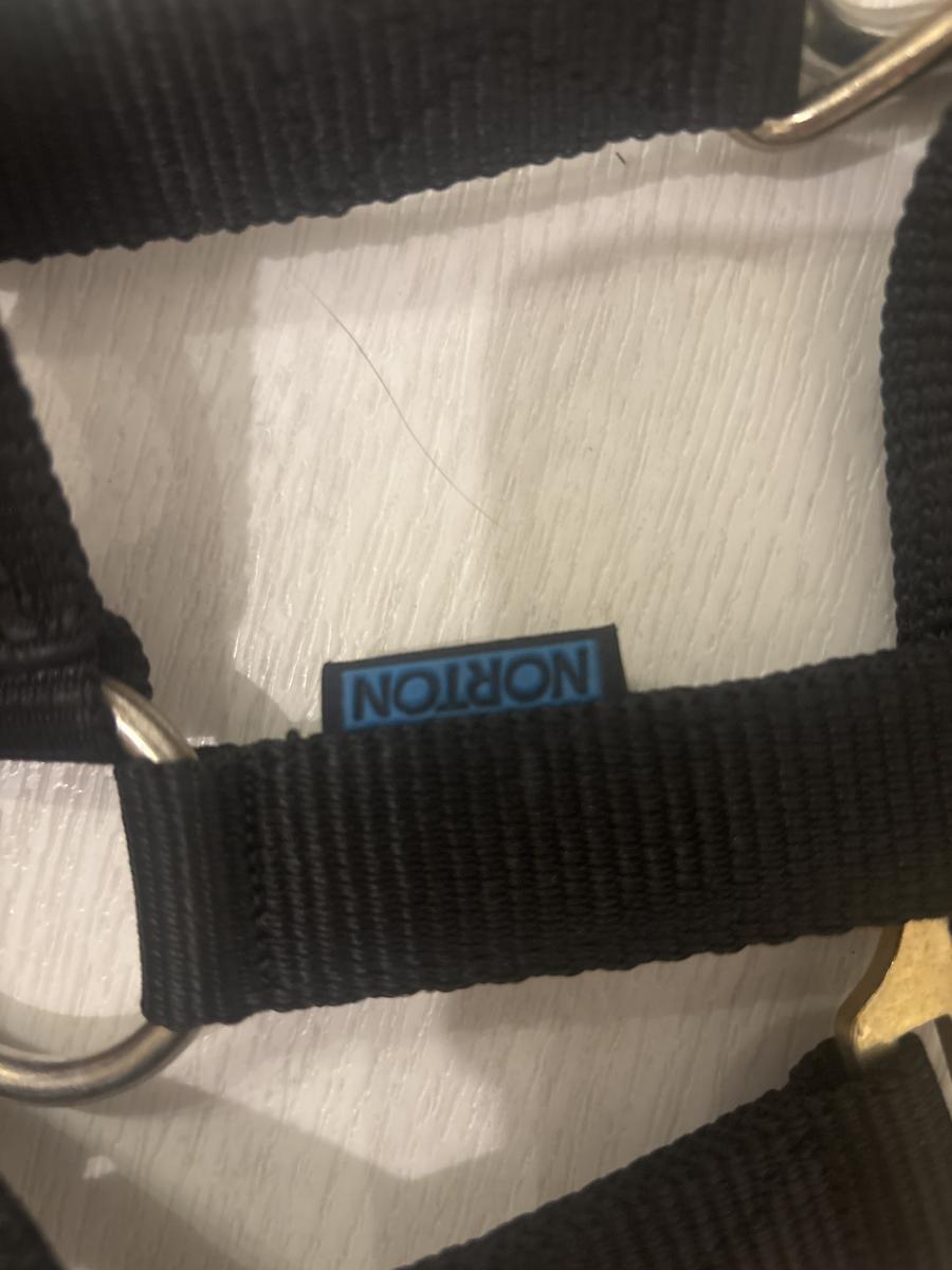 Licol noire de la marque Norton vendue avec une longe en corde et son mousqueton déjà fixé. Les anneaux du licol sont couleur. Or, comme montré sur les photos, ils se sont légèrement détériorée dû à un mauvais stockage, mais le Orol n’a été utilisé que 2 ou 3 fois.