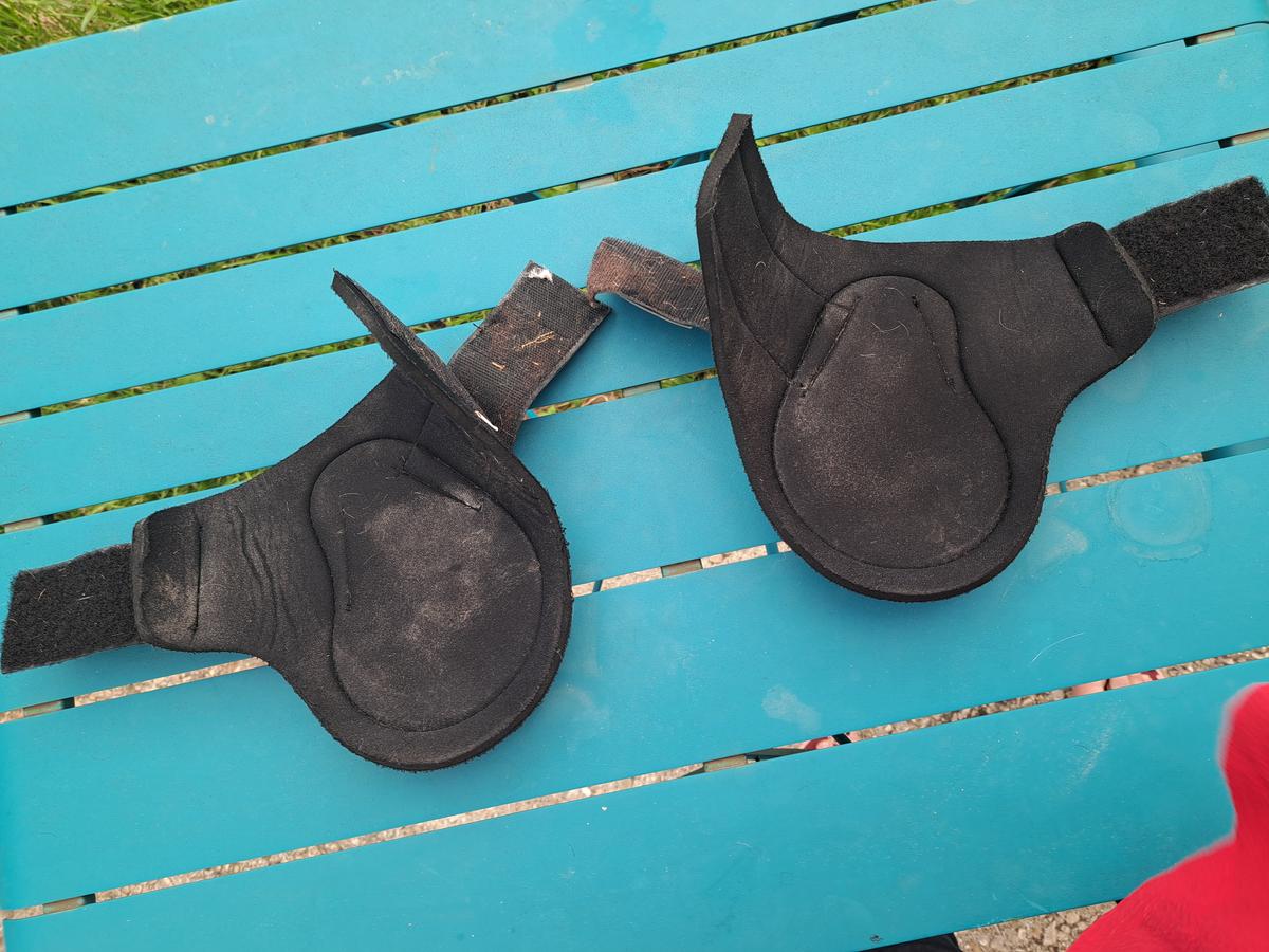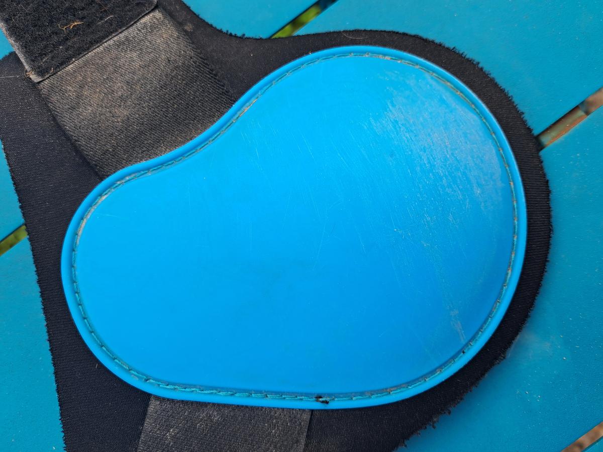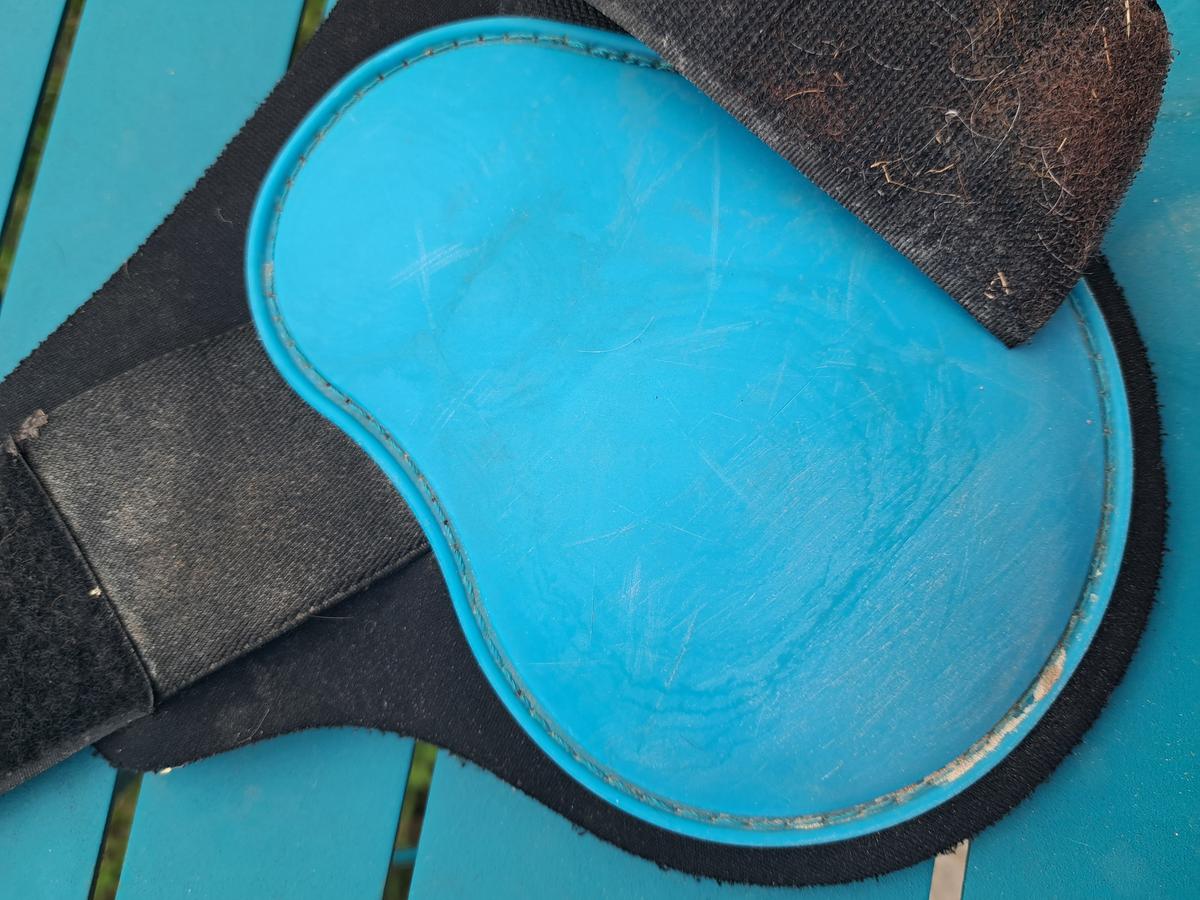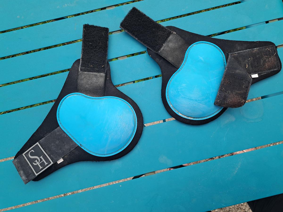 Paire de protèges boulets Showmaster turquoise, bien utilisé mais peuvent encore servir.