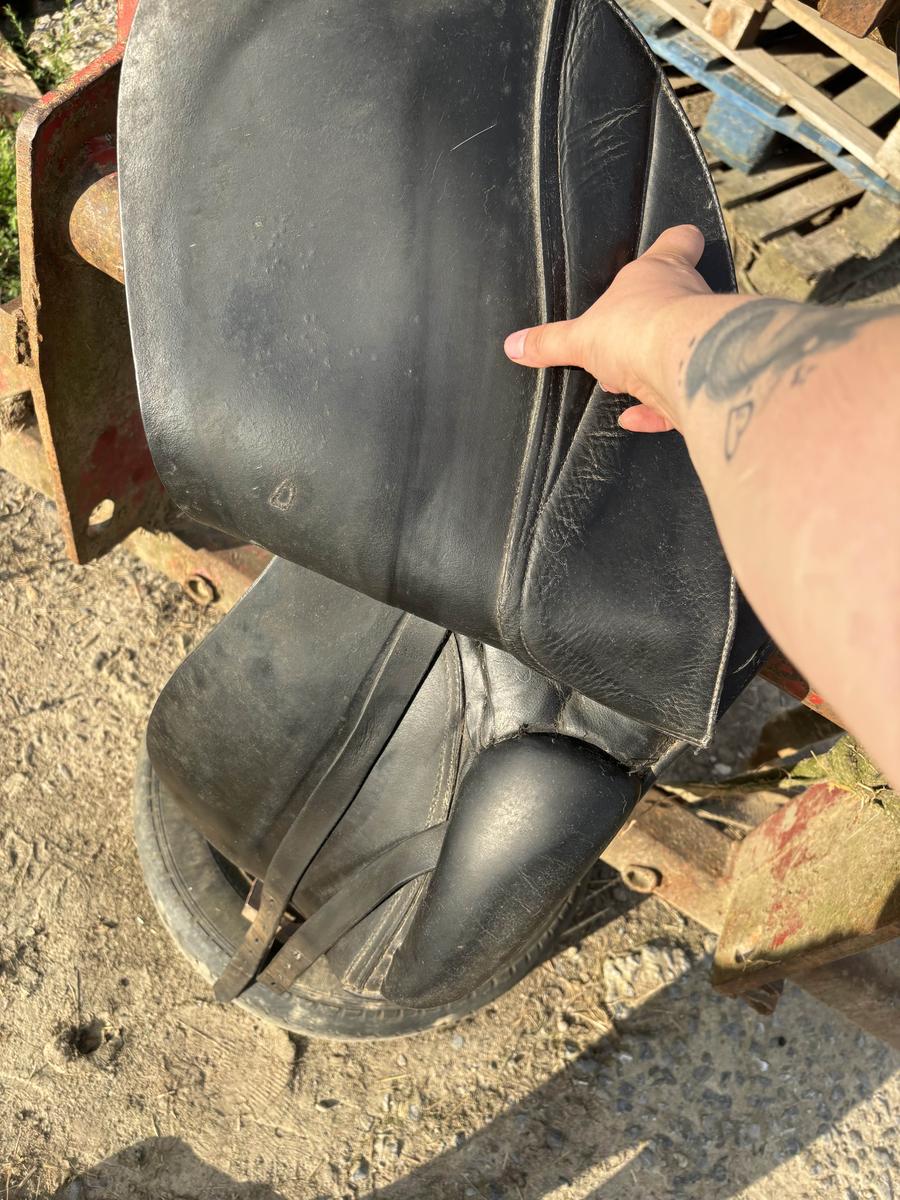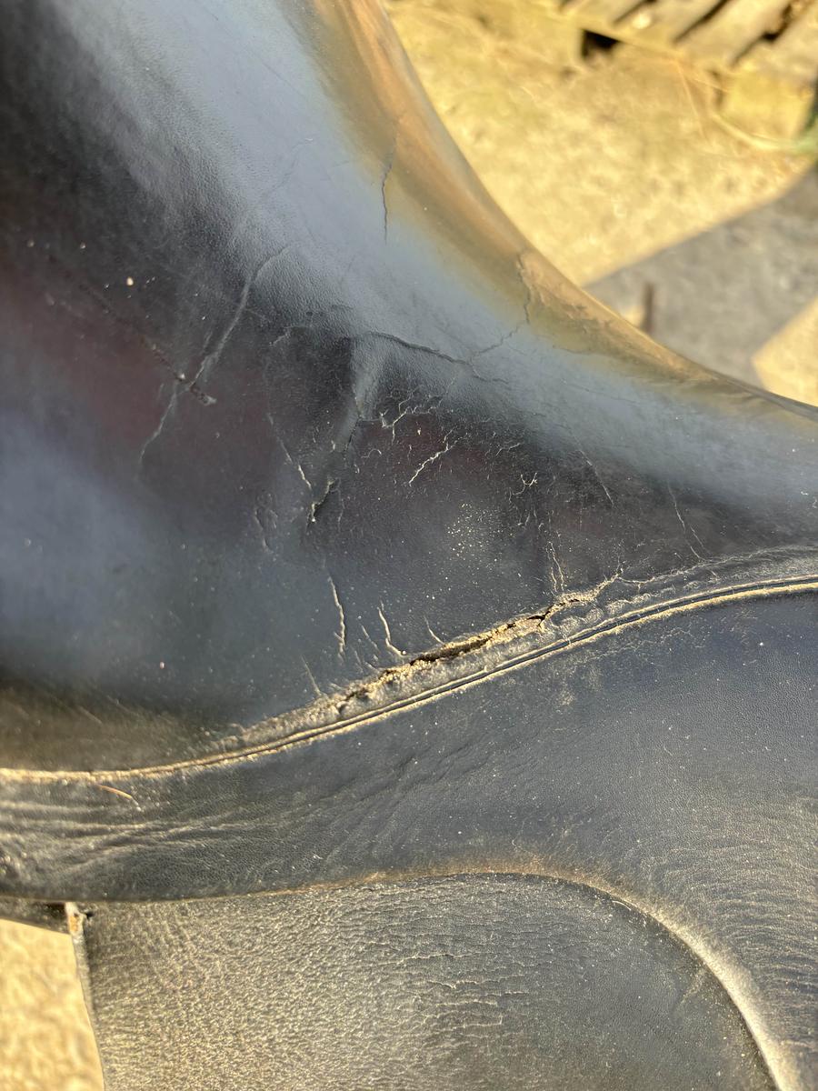 Selle de dressage en bon état général, cuir abîmé au niveau de l’assise ; ne se voit pas une fois dessus et ne gêne en rien