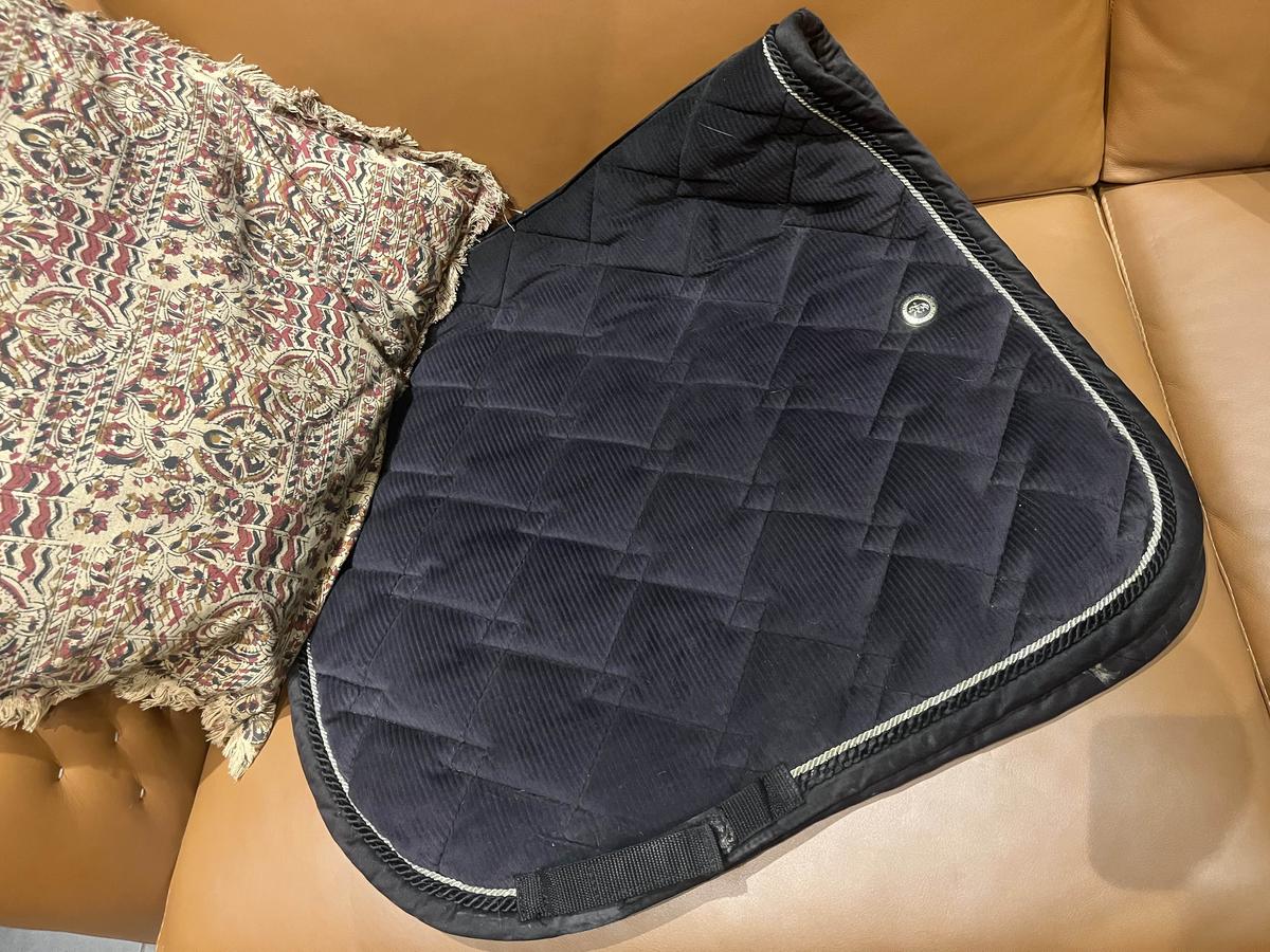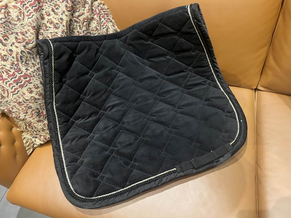Tapis de dressage noir liseré argent légèrement doré en bon état général et de très bonne qualité !