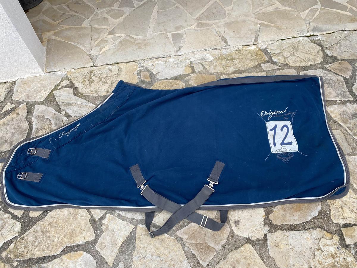 Couverture polaire Fouganza 135 cm en bon état. Elle a été lavée mais il reste des poils incrustés dans la couverture. Possède deux sangles au poitrail, deux sangles sous le ventre mais n’a pas de sangle au passage des cuisses (mais elle peut être rajoutée grâce à des anneaux)