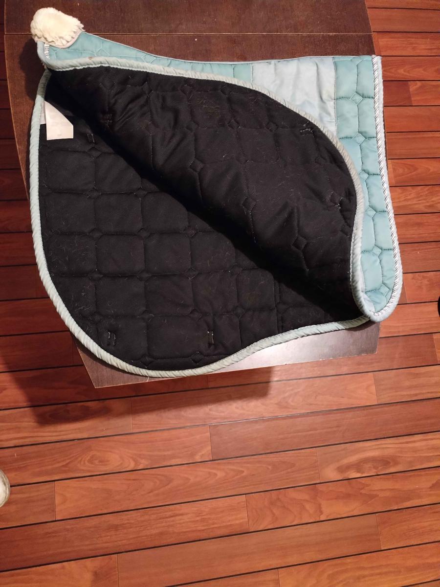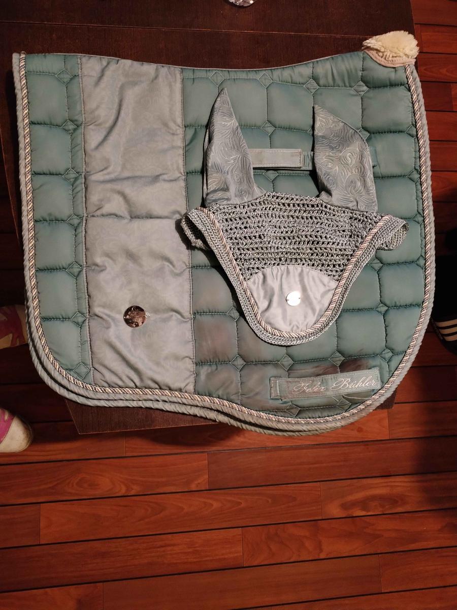 Ensemble tapis de dressage avec poches et bonnet Félix Bhüler, taille cheval, couleur vert d'eau.