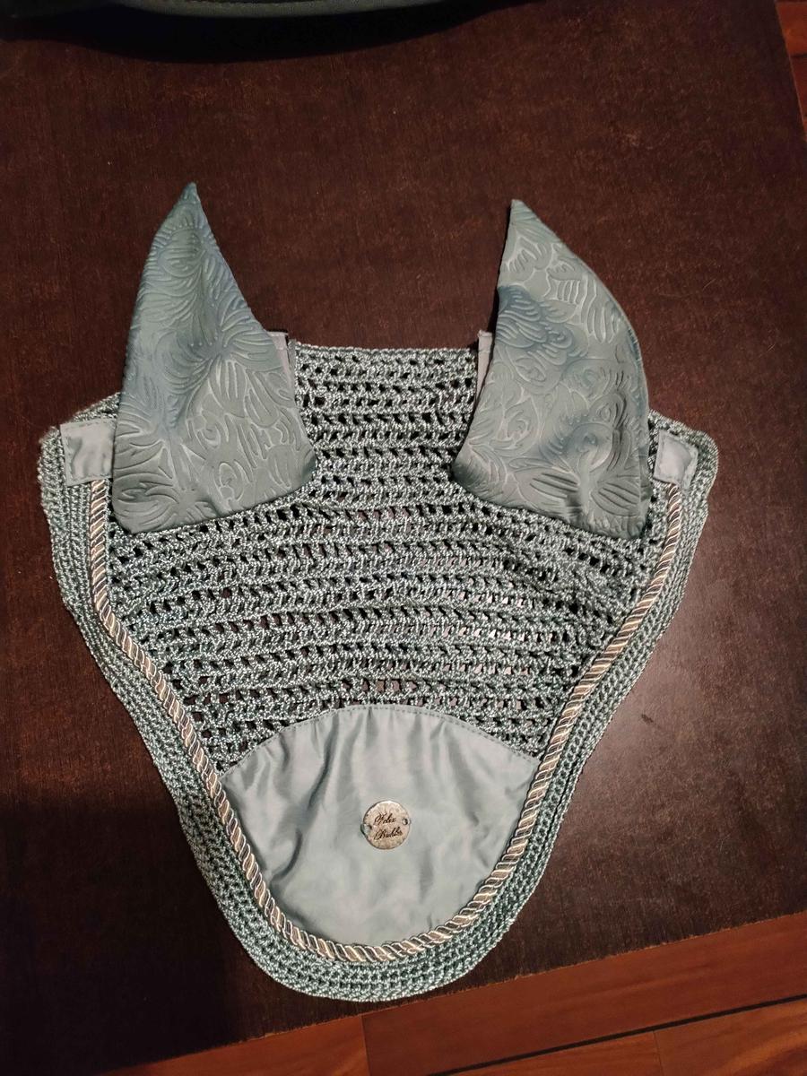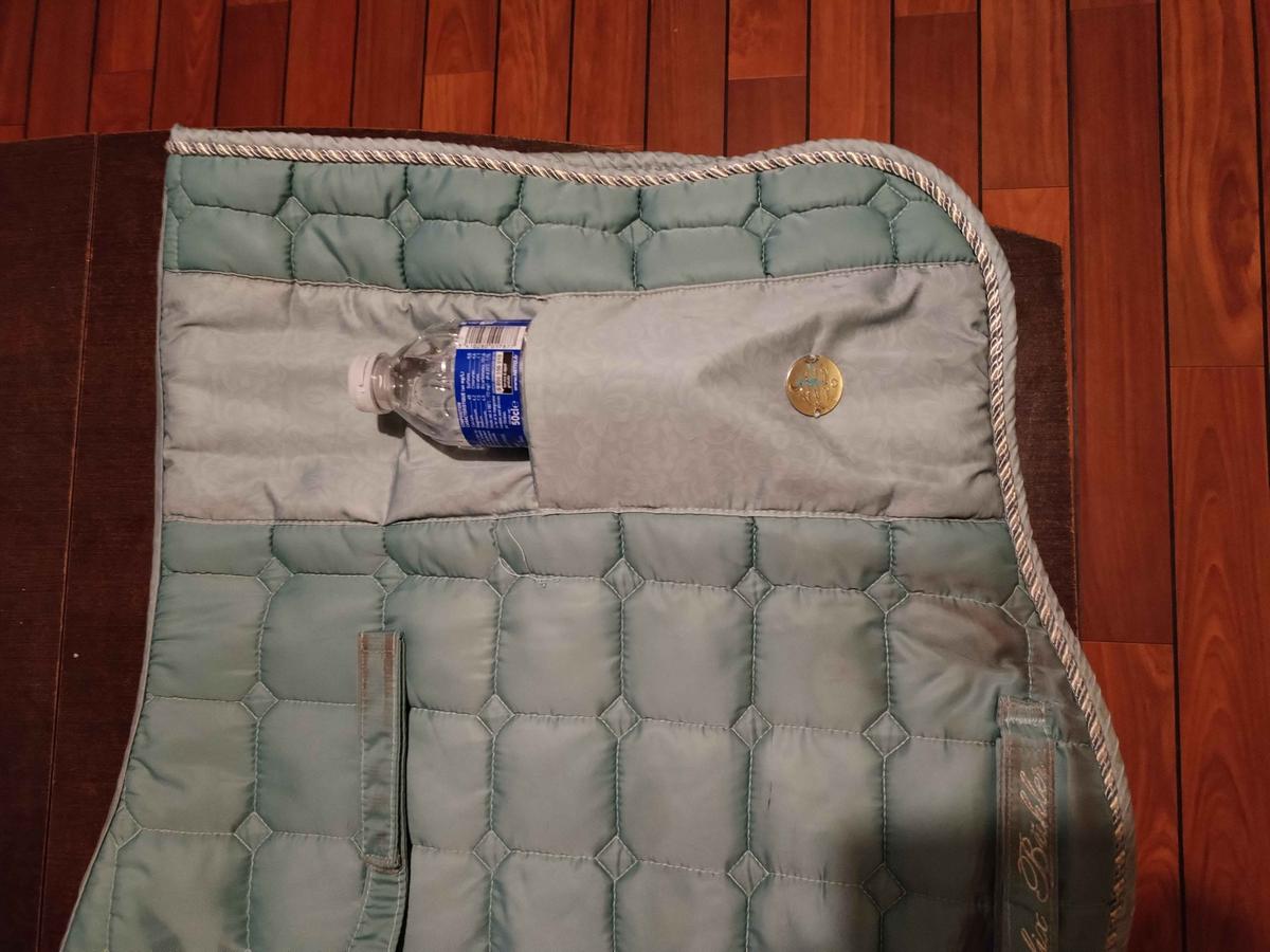 Ensemble tapis de dressage avec poches et bonnet Félix Bhüler, taille cheval, couleur vert d'eau.