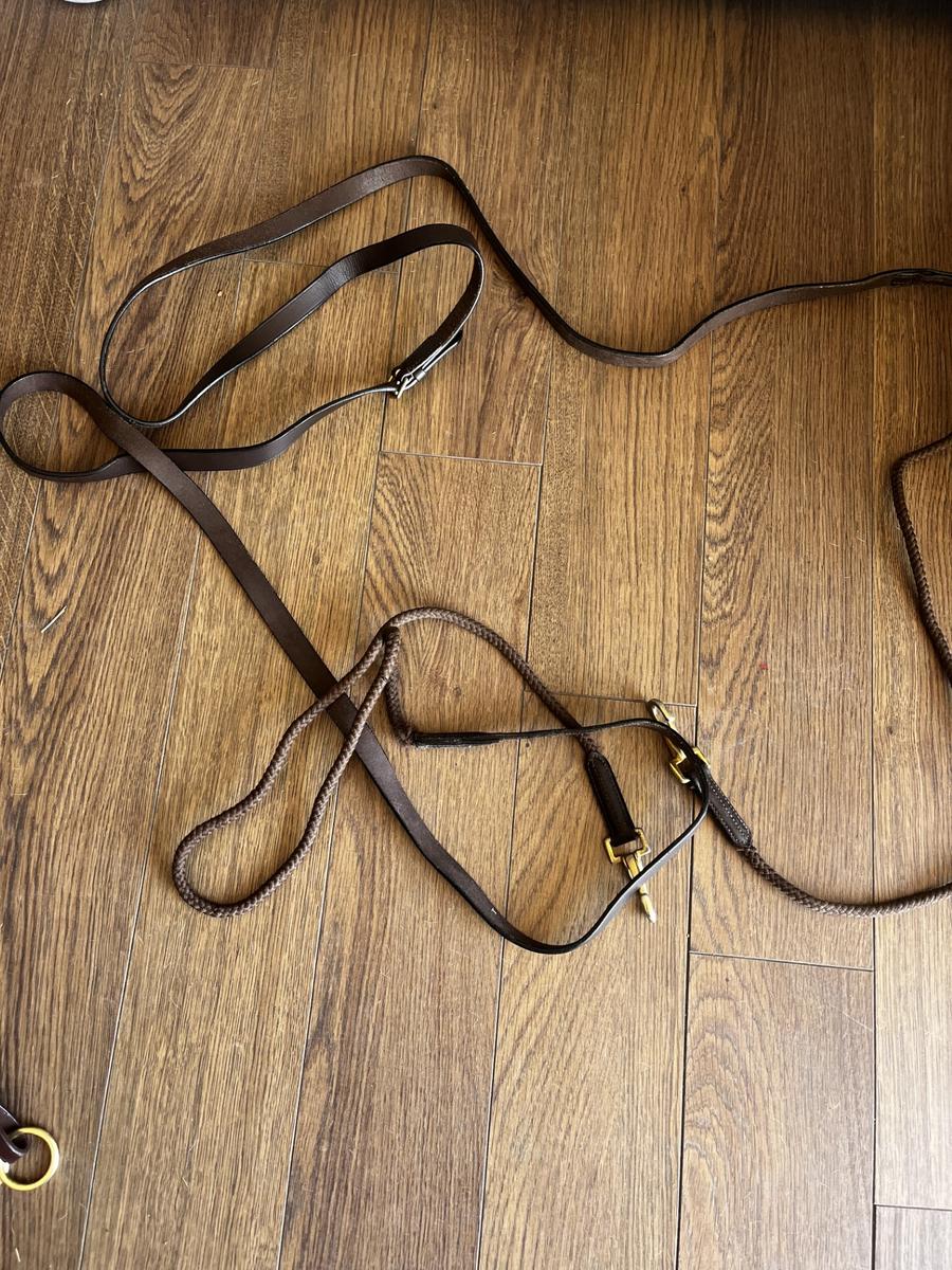 Rênes allemandes marron (occasion) et attache enrênement (neuf) taille cheval