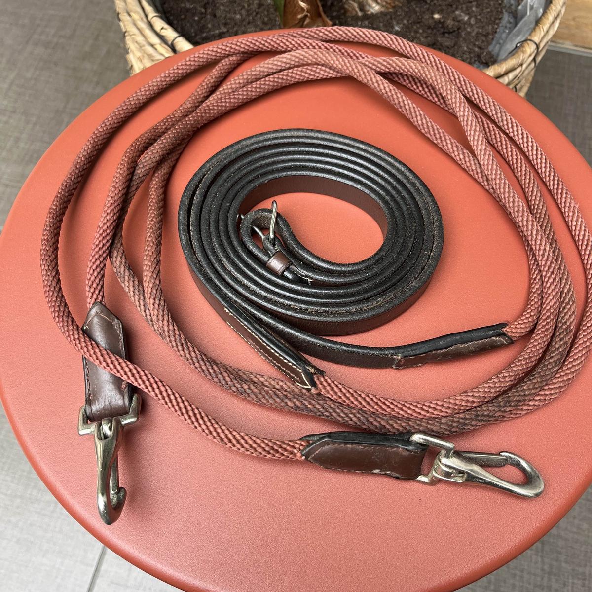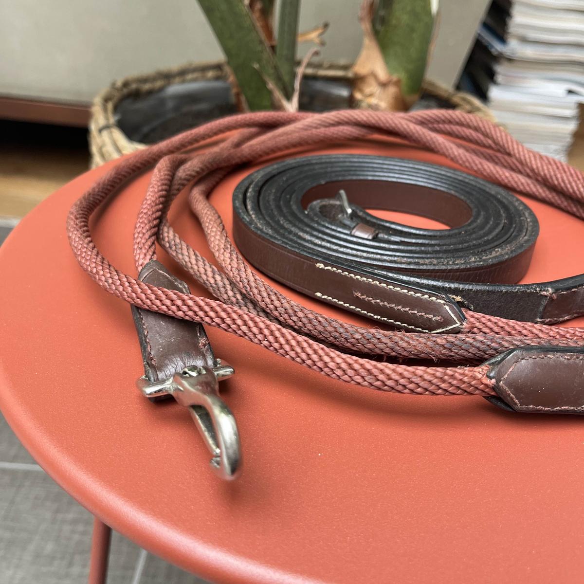 Rênes allemandes. Modèle « One ». Marque JUMP’IN. Cuir coloris havane et partie corde bordeaux (rend plus clair sur les photos). Taille cheval. Bon état. Pas de défauts sur la partie cuir, les boucles ni attaches. Traces d’utilisation sur la partie corde.