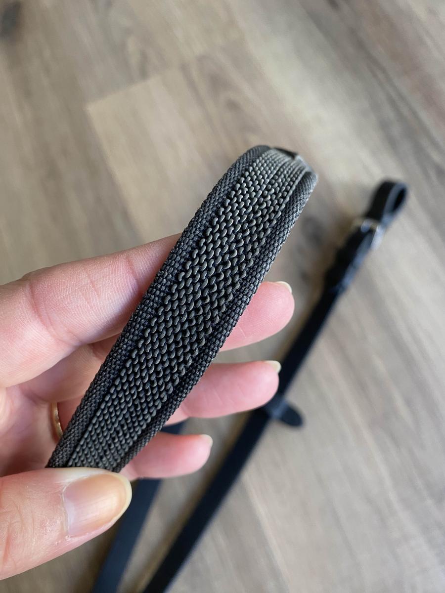 Rênes d’équitation Fouganza cuir grip silicones, très fines et souples (ce n’est pas le modèle grip très épais) mais avec bonne adhérence.