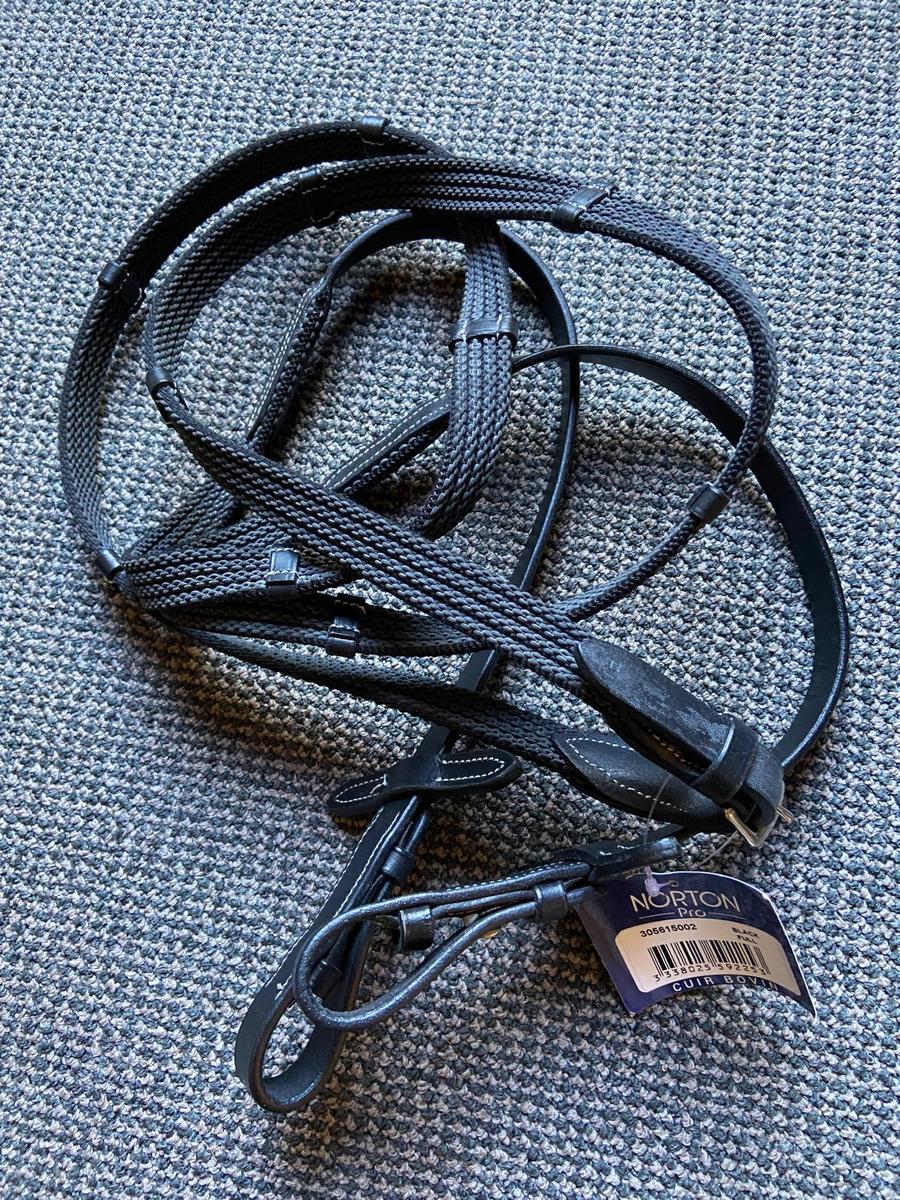 Rênes Norton avec arretoirs, disponibles en noir ou marron, taille cheval, en cuir
