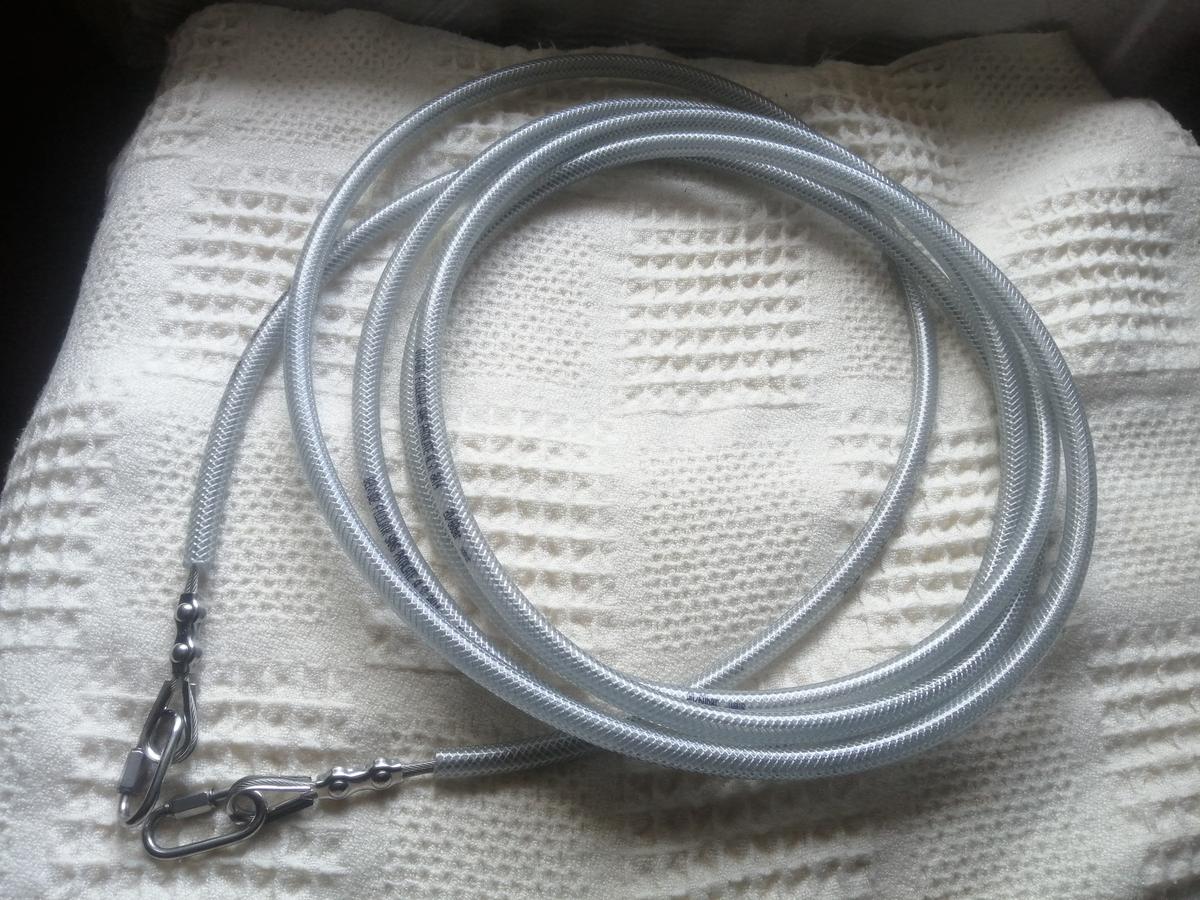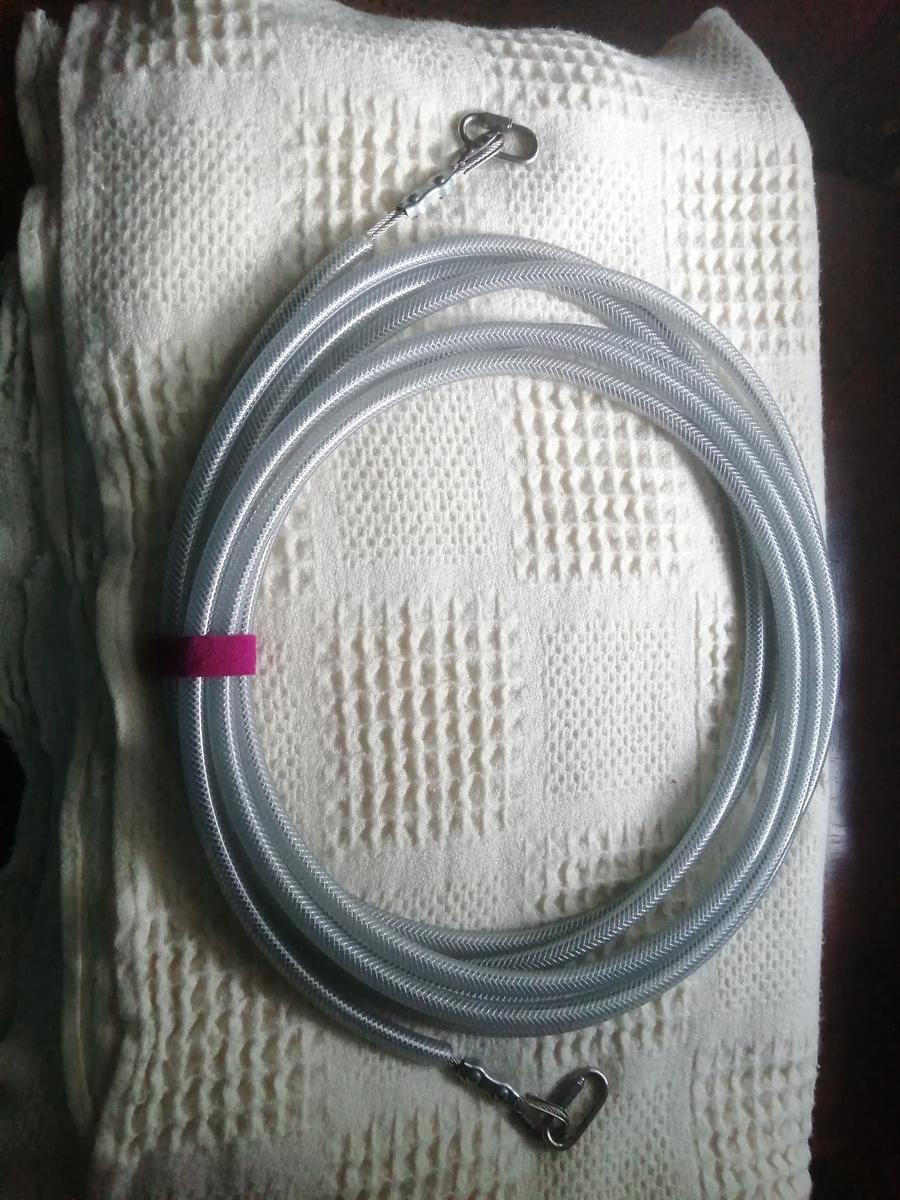 Filin en acier inséré dans un tube en pvc armé. Évite que l'animal ne s'emmêle les pieds dedans.