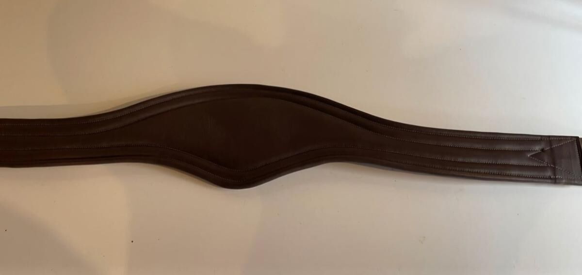 Sangle anatomique en cuir vachette matelassé mousse EVA de 4mm. Marron taille 145cm. Equipée d’un anneau central et d’anneaux latéraux pour la fixation des enrênements.