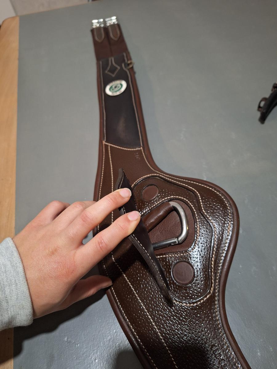 A vendre sangle en casiment neuve en cuir taille 130cm. Avec élastique des deux côtés, et 3 anneaux d'attaches