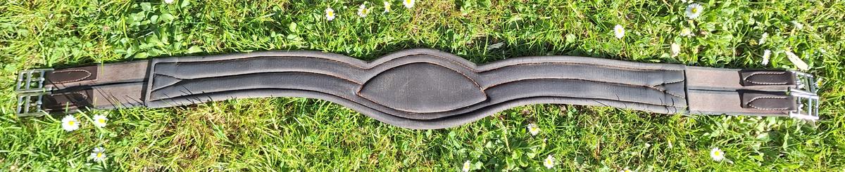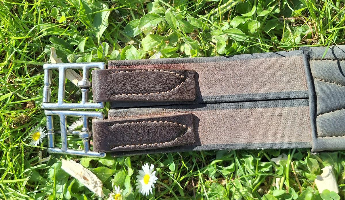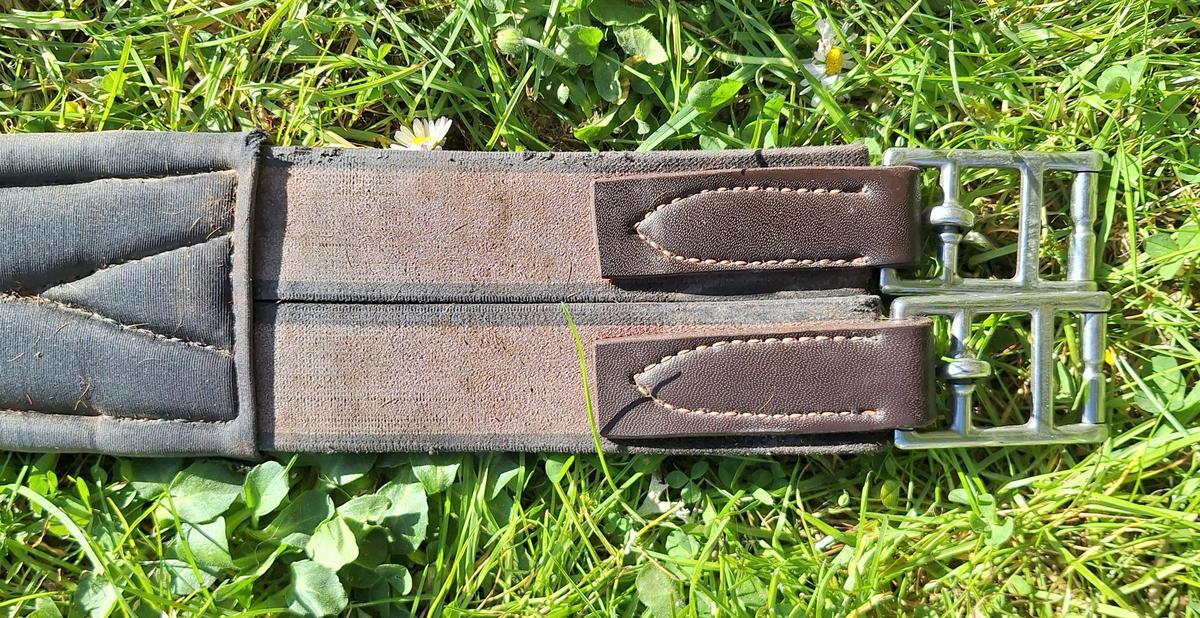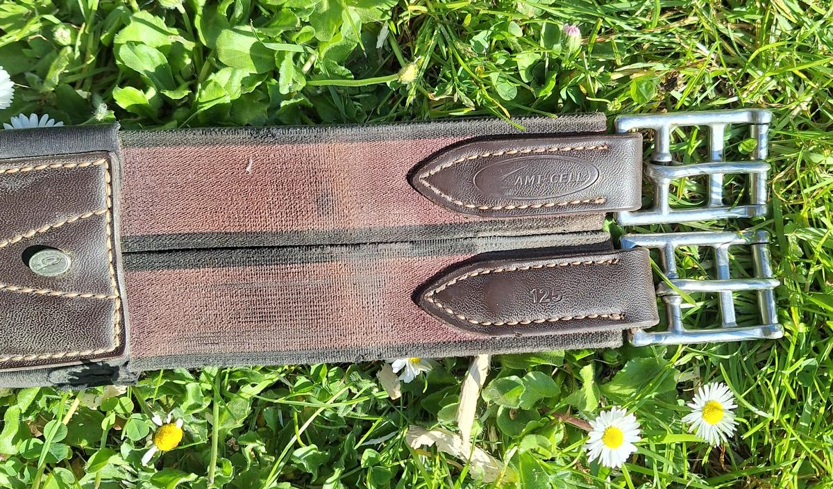 marron, utilisée mais en bon état, pas de signe de dégradation des élastiques, boucles inox impeccables, un anneau pour fixation d enrennement,