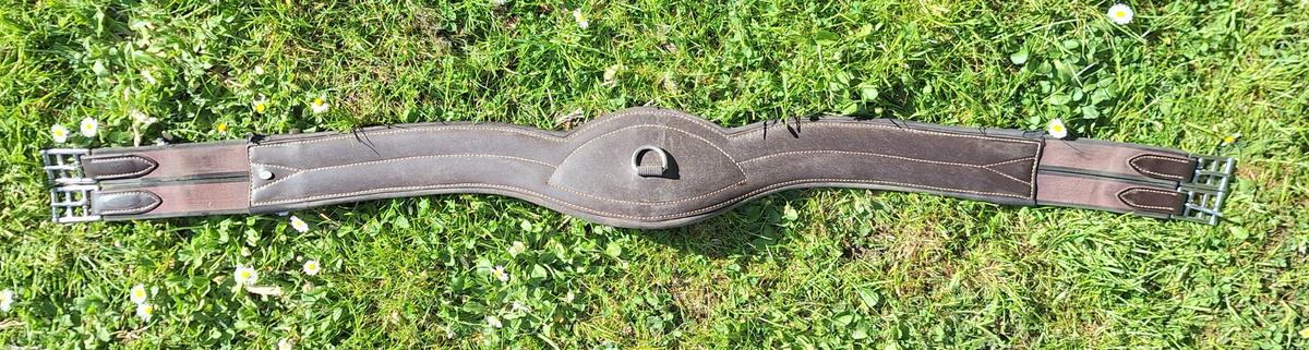 marron, utilisée mais en bon état, pas de signe de dégradation des élastiques, boucles inox impeccables, un anneau pour fixation d enrennement,