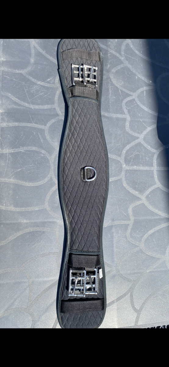 Sangle de marque Lami cell modèle V22 en Néoprène résiste à l'eau et aux UV forme anatomique avec geo à l'intérieur qui réduit les points de pressions, Tissu matelassé, boucles en inox résistantes et anneaux centraux pour enrênement. deux taille disponibles 60cm et 55cm car ne convenaient pas à la jument