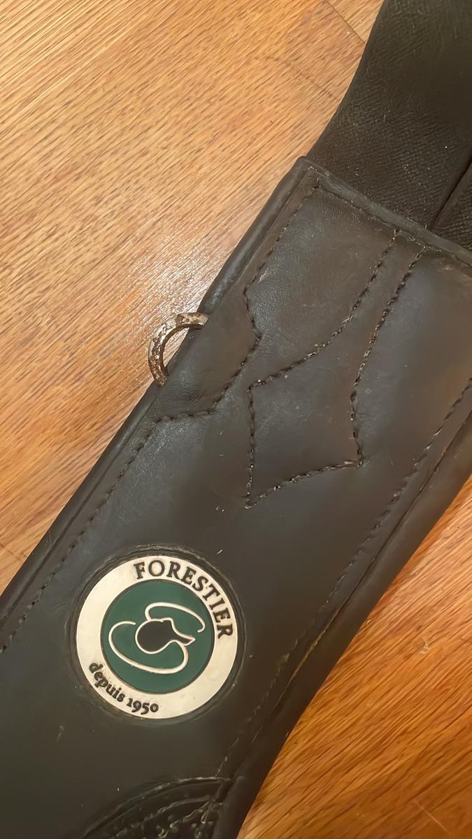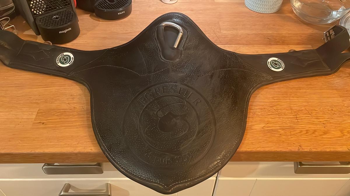 Cette bavette est en cuir noir, taille 115cm