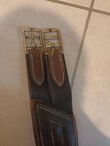 Les élastiques ne sont pas distendus. Il y a bien quelques tâches voir les photos, et des griffures mais honnêtement c'est en dessous ça empêchera pas Toto de faire 140 sans faute. Faudrait qu'il saute largement plus haut pour que la foule voit le dessous de ton poney. Donc si tu dis rien personne va savoir qu'en dessous ta sangle est griffée hein! Elle est marron et c'est une 125cm.