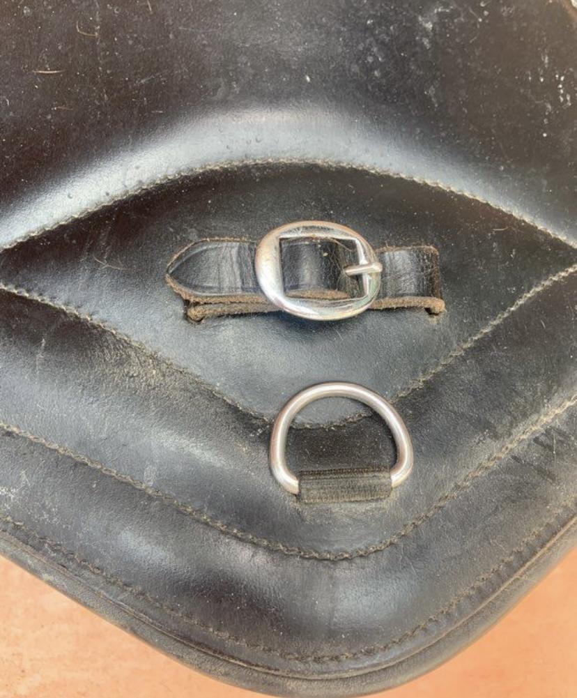 Équipée d’un anneau central et d’une patte de fixation cuir à fermeture à boucle au centre et d’anneaux latéraux pour la fixation des enrênements. Boucles à rouleaux.
