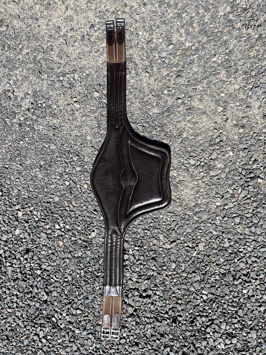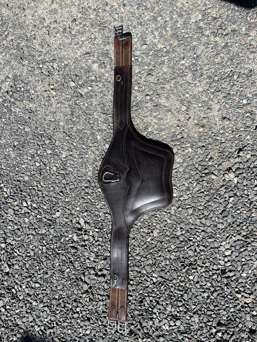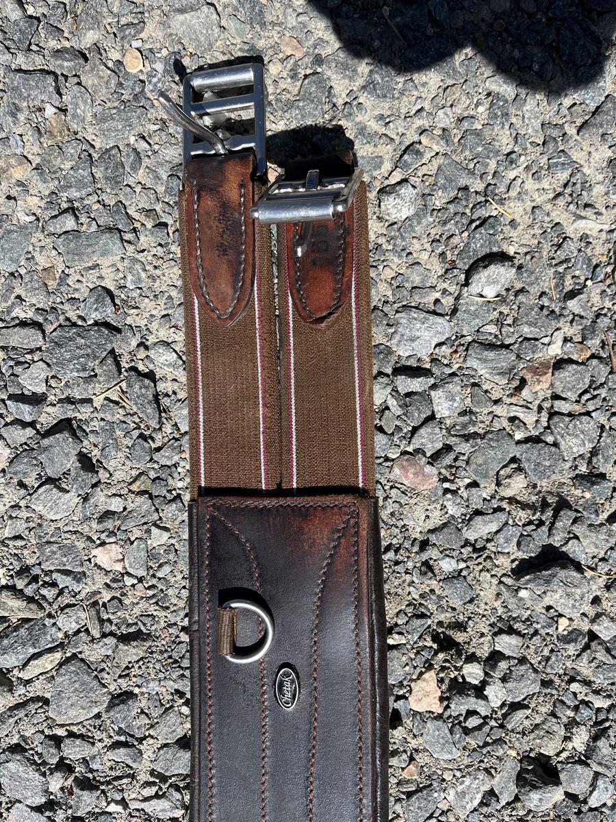 Sangle bavette Chetak, cuire marron foncé, utilisée mais entretenue, avec élastiques.