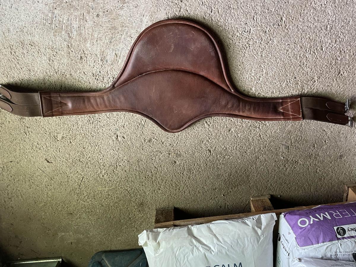c’est une bavette en cuir de vachette utilisée quelques fois en concours seulement et reste donc en très très bon état comme vous pouvez le voir!
