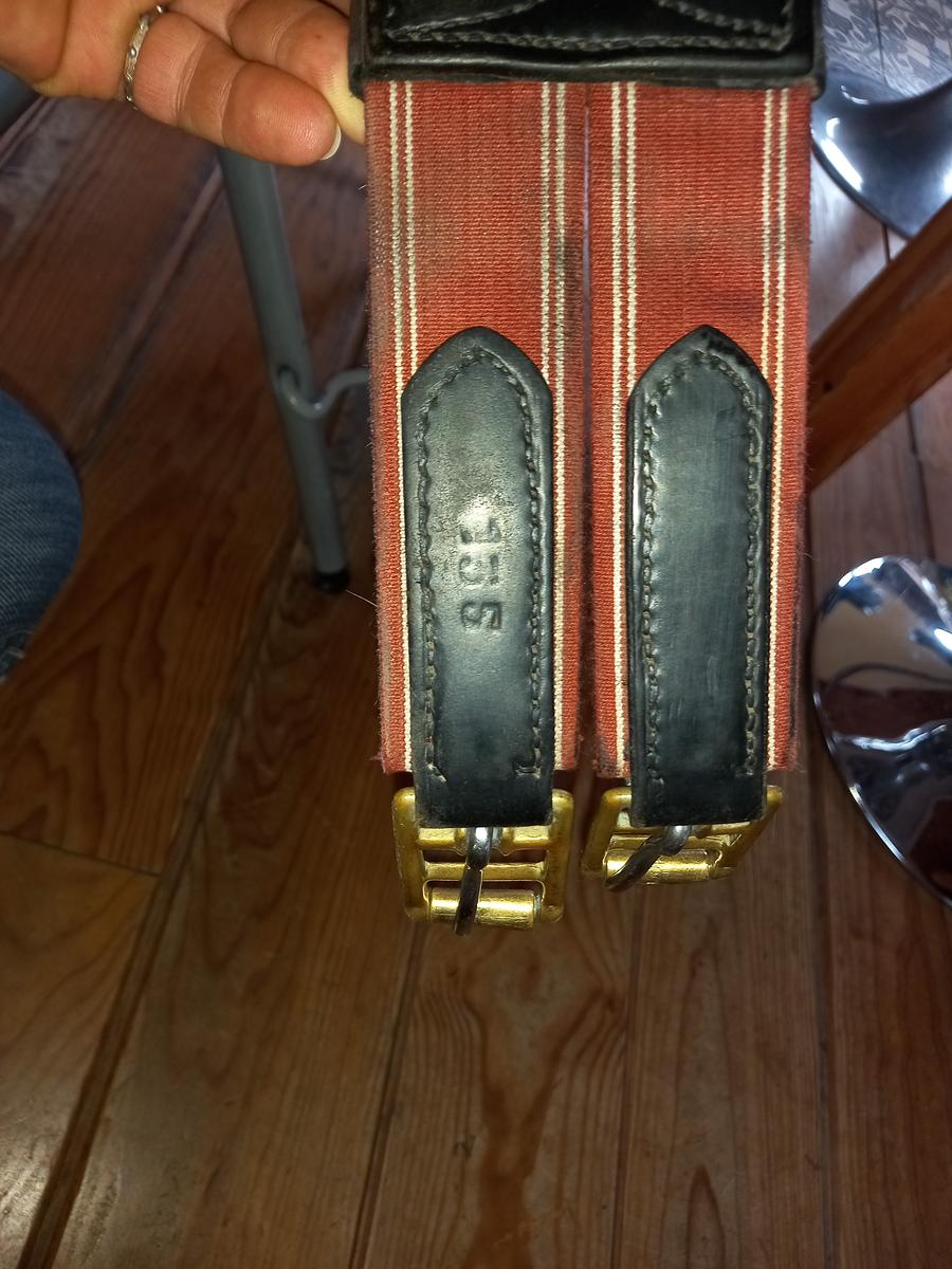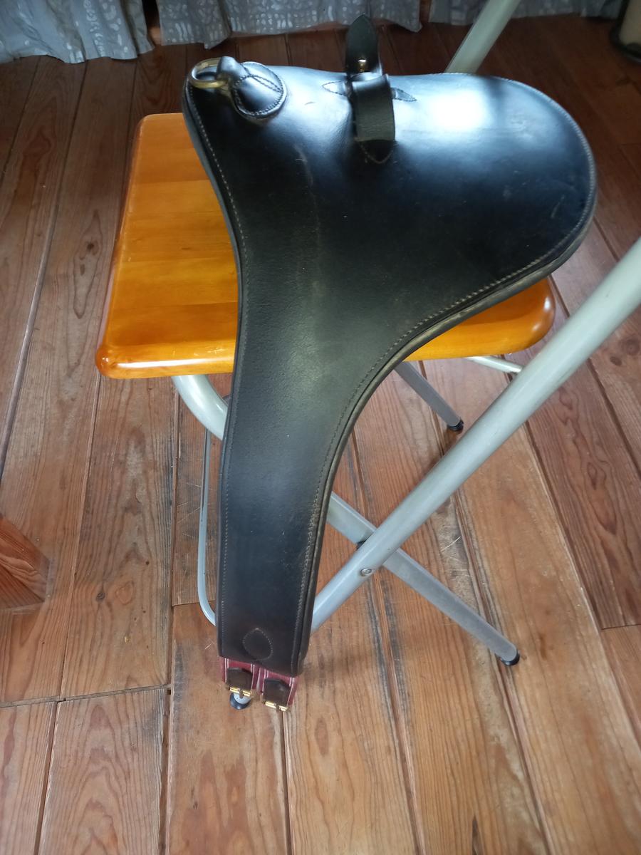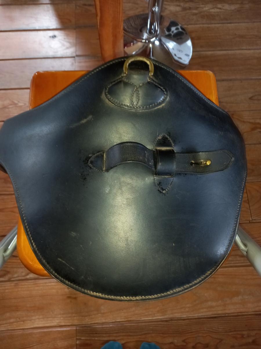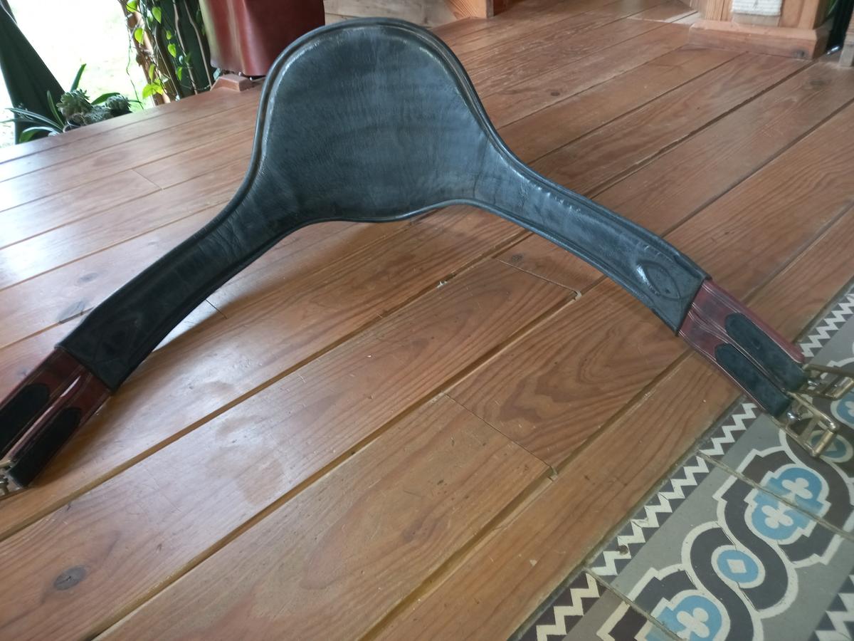 Sangle bavette en cuir noire 135cms en bon état, quelques traces.