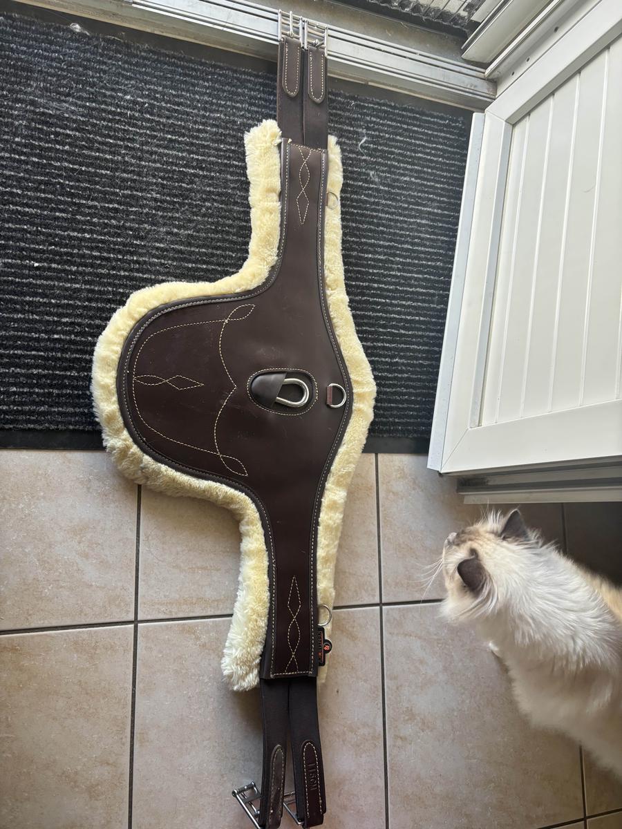sangle bavette kentucky cuir marron , forme anatomique libère les épaules et coudes, protection EVA, trois anneaux, mouton attaché par velcro détachable et lavable. Porté une fois pour un parcours car oublie de la mienne.