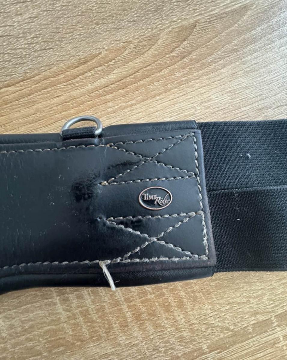 Sangle bavette Time rider En 105cm en cuir noir Acheté déjà d'occasion mais servi que quelques fois. suite au changement de la selle elle ne convient plus Quelques égratignures mais ça ne gêne pas en son utilisation