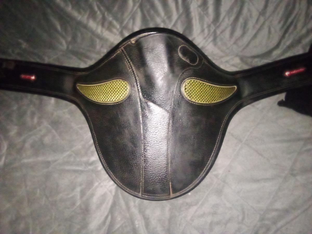 Sangle bavette en très bon état de couleur noir, taille 130 mais correspond à du 125 car cette sangle bavette est légèrement déporté pour éviter les mauvaises pressions. Elle est faite avec du kevlar, bien rembourré. Faite pour le confort du cheval, il y a un mousqueton pour les enrenement qui est caché sous un aimant.