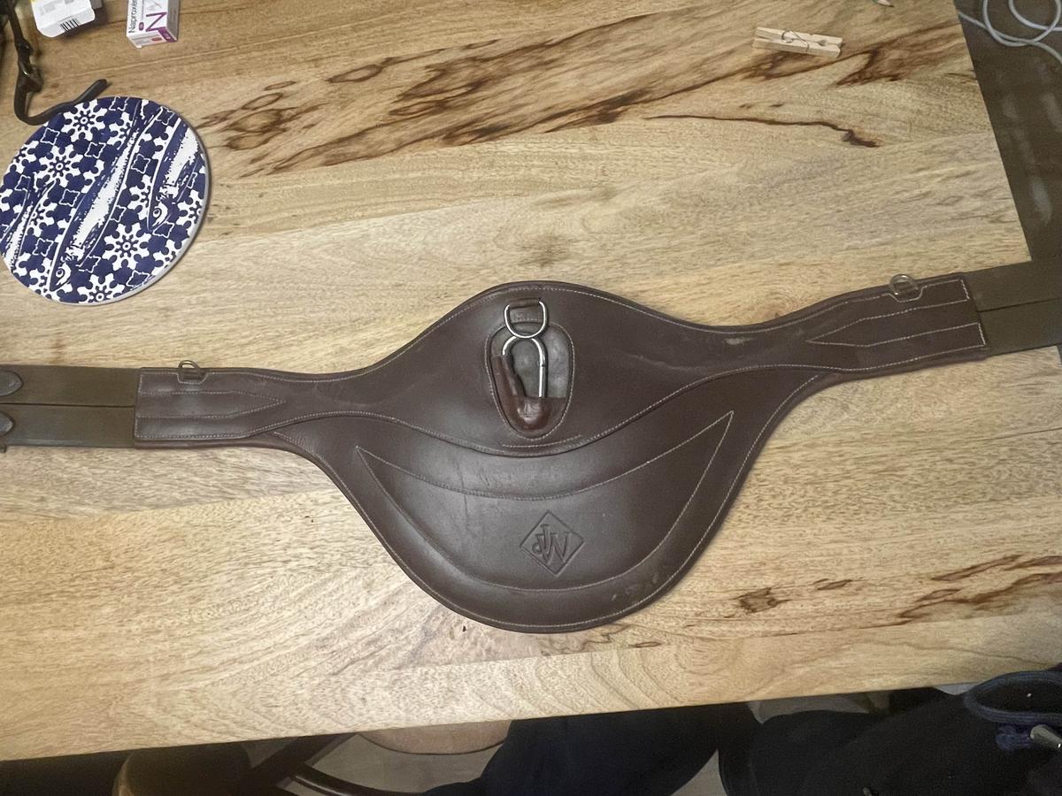 Bavette marron 125 cm de la marque John Witaker en très bon état, à part le petit défaut au niveau de l’accroche du mousqueton elle est parfaite. le cuir est très souple, elle sera nettoyée avant envoi.