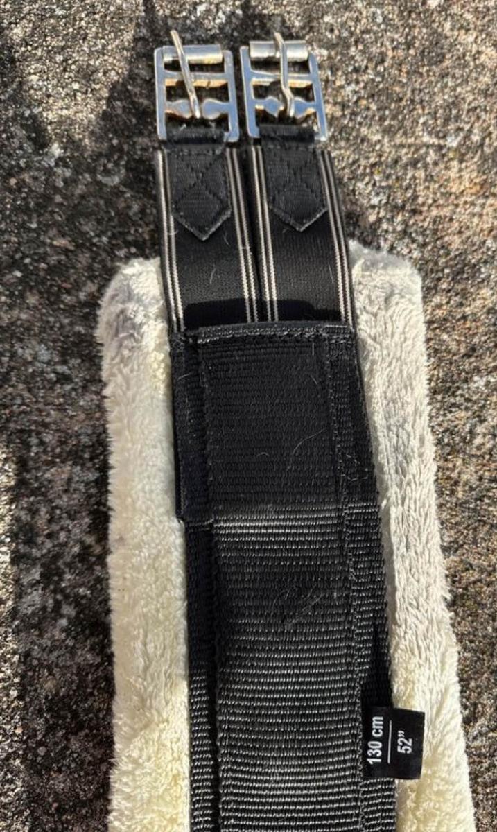 Sangle en nylon résistant à la déchirure avec élastiques des deux côtés, anneau central en D et boucles à rouleaux. Doublure en polaire Teddy extra-douce. Presque neuve. Utilisé 3x et lavée a chaque fois, elle est trop petite pour mon cheval. Taille 130cm. Valeur neuve 60€