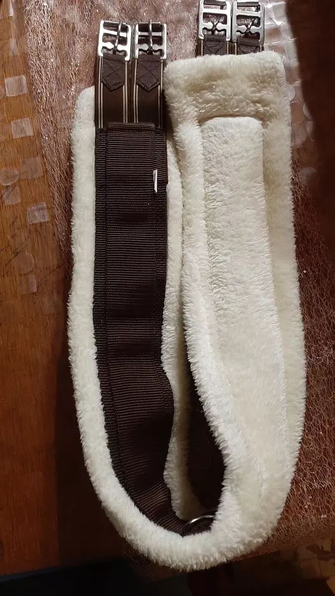 Sangle mouton synthétique Norton, marron, sanglons élastiques, anneau d'attache pour enrênement, taille 125cm, peu utilisée