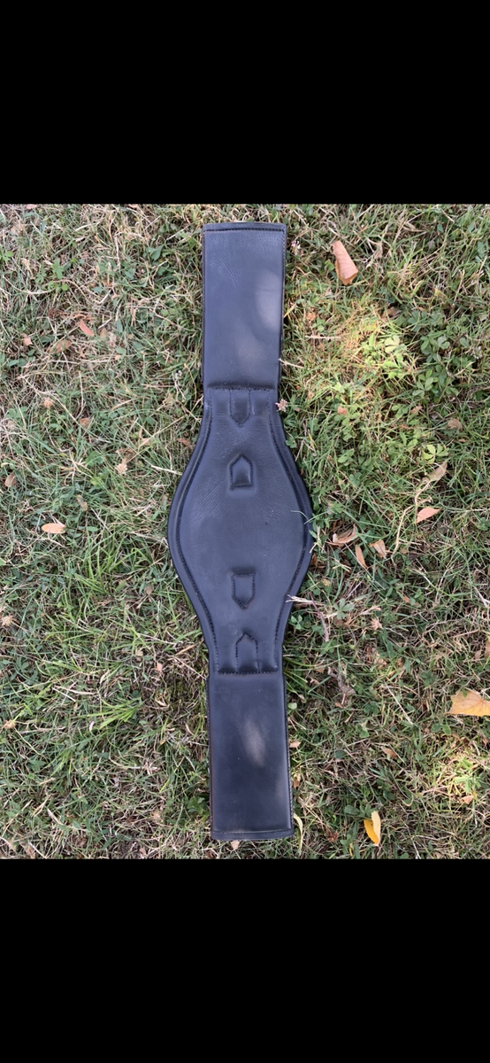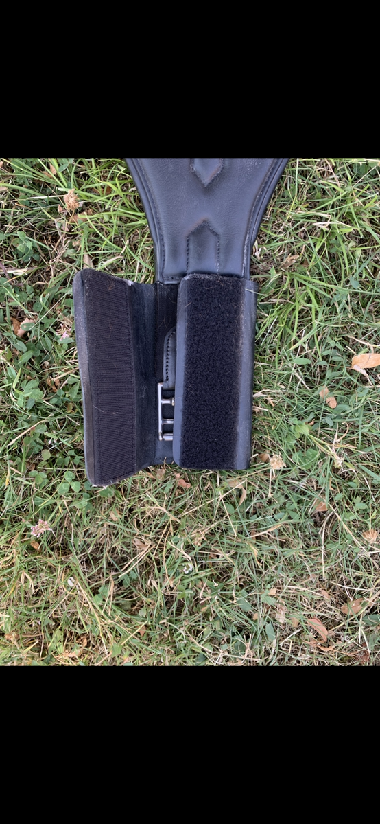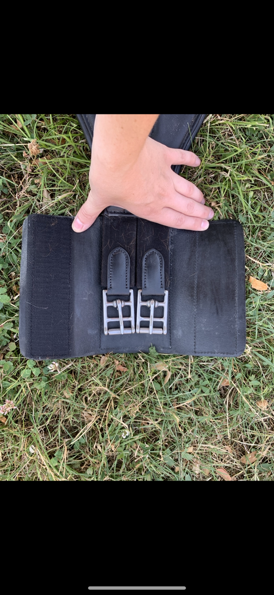 Sangle en cuir noir Flags and cup. Très bon état. Achetée début juillet, utilisé une dizaine de fois mais ne convient pas à mon cheval.