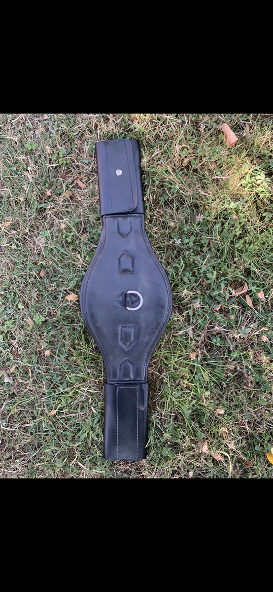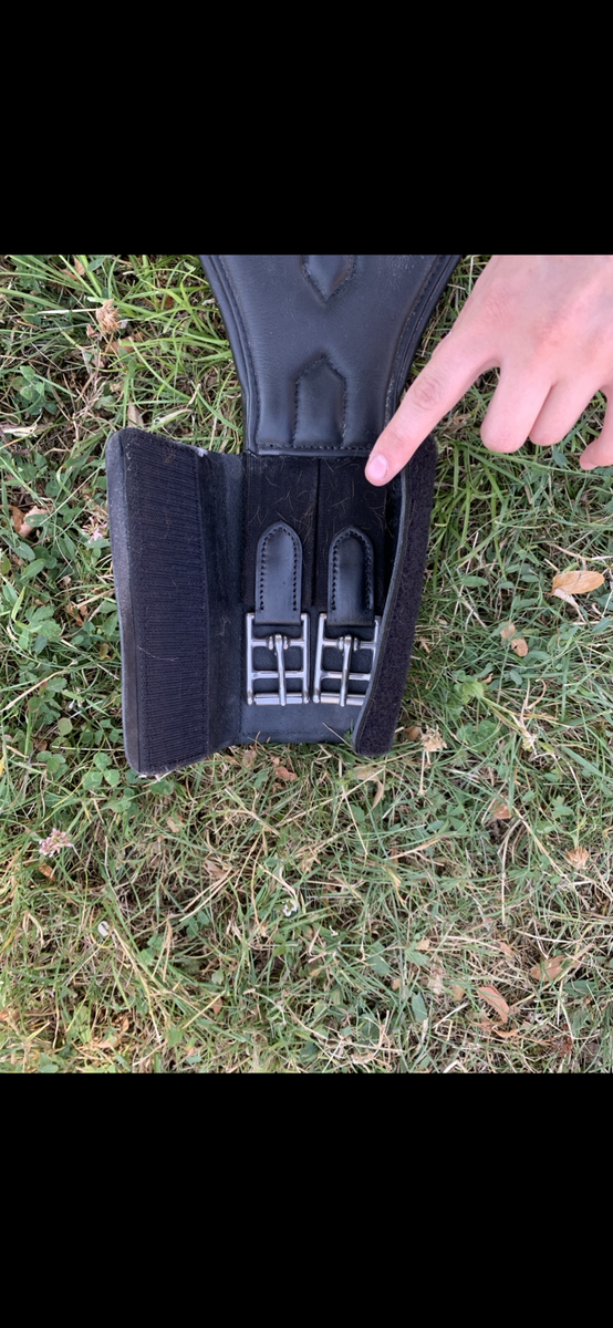 Sangle en cuir noir Flags and cup. Très bon état. Achetée début juillet, utilisé une dizaine de fois mais ne convient pas à mon cheval.