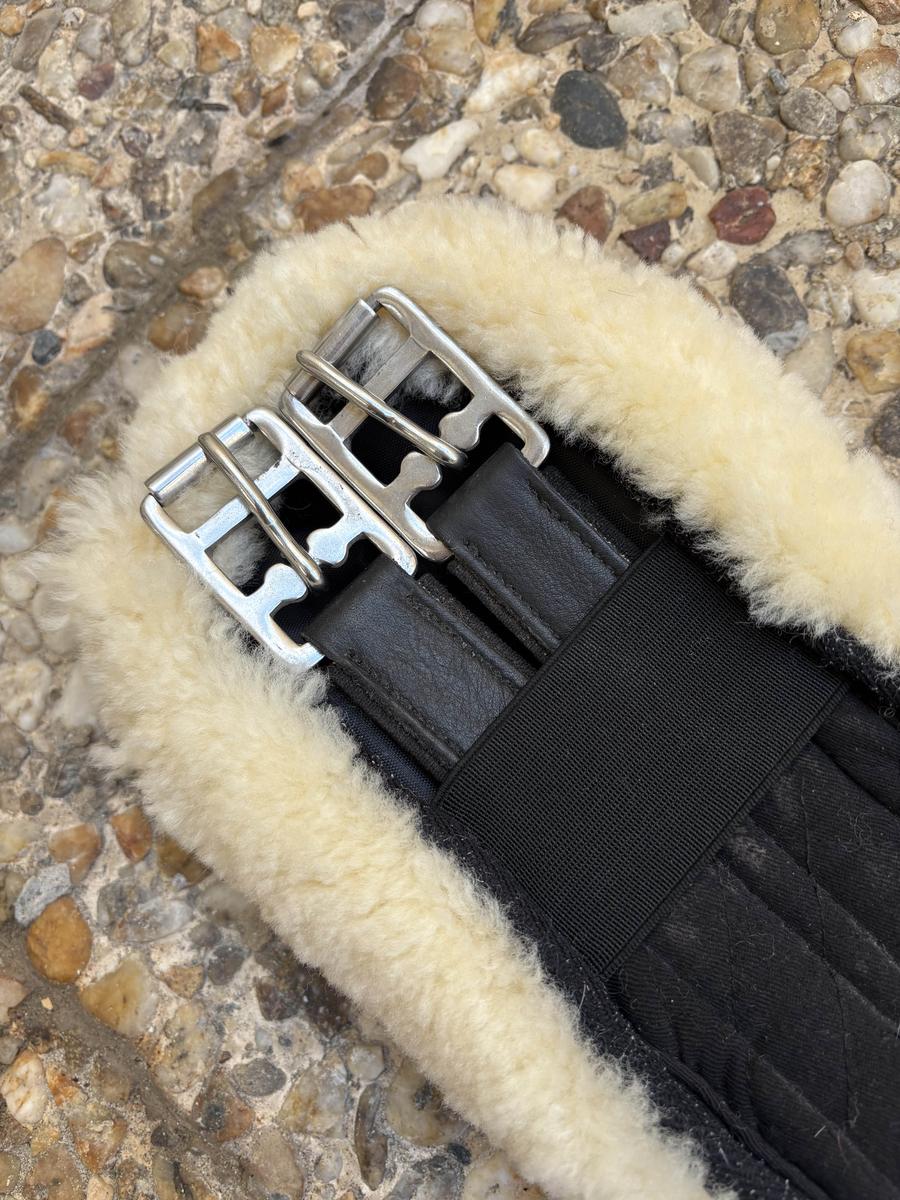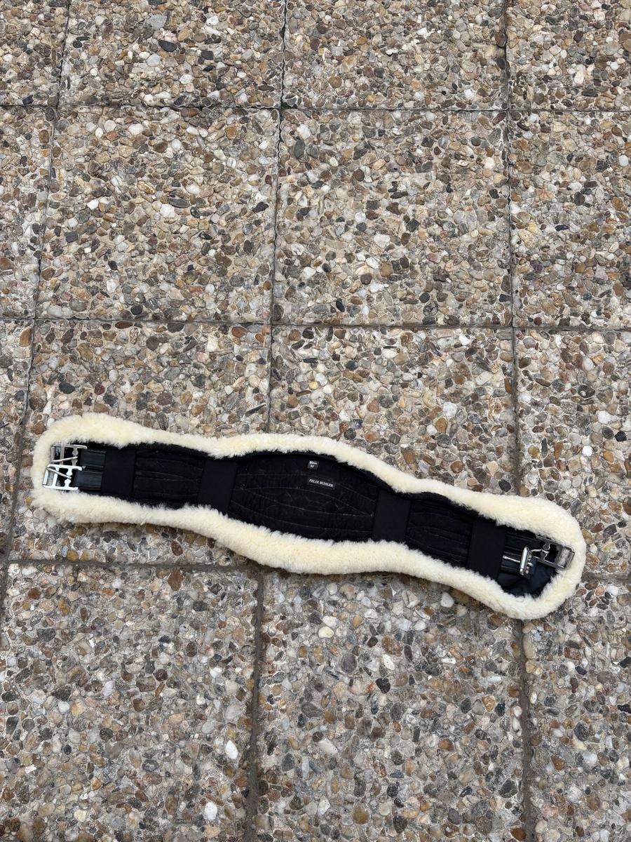 « Sangle courte anatomique demi-lune particulièrement confortable, fabriquée dans un tissu matelassé à la fois robuste et souple et avec doublure en fourrure d'agneau. Assure un ajustement et une répartition optimale des points de pression. Avec anneau en D centré et empiècements élastiqués des deux côtés.