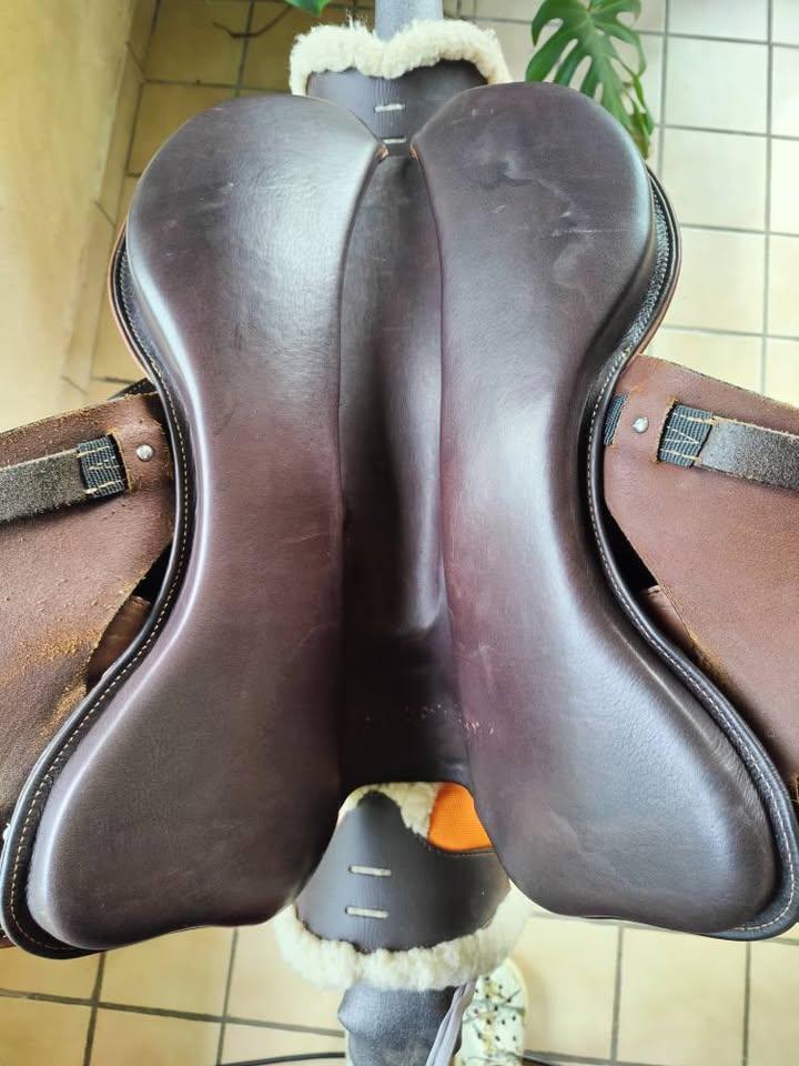 Selle Margeride 17,5 pouces, ouverture garrot 26 (Arçon carbone) équipée de fenders en cuir taille M avec des étriers Bi-relax alu. Le tout en très bon état.