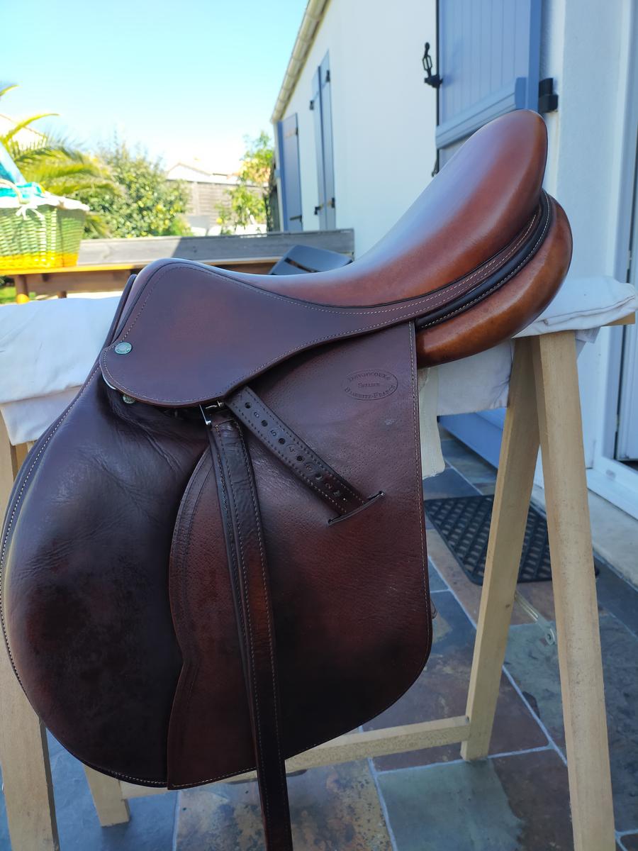 Selle de saut Devoucoux très peu servie en parfait état vendu avec étrivières et étriers taille 17 pouce