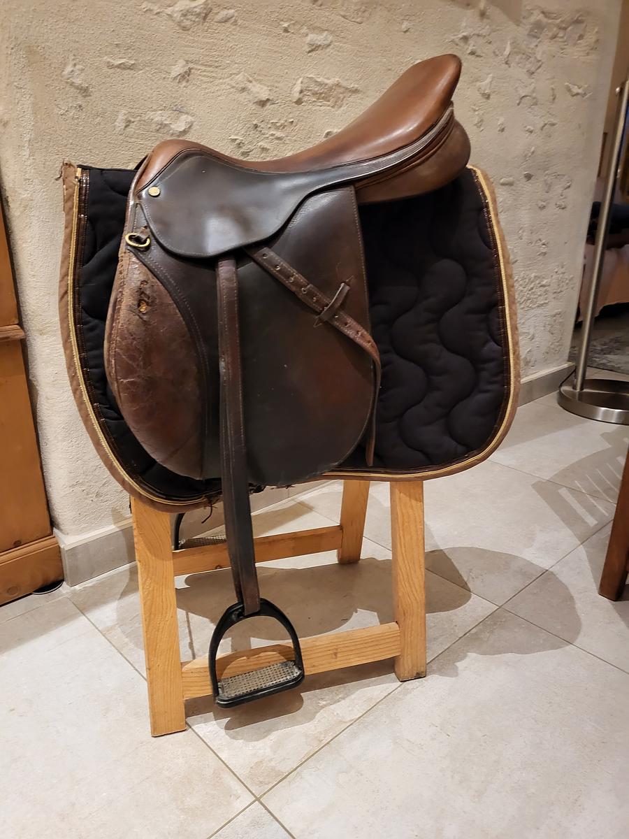 Selle d'obstacle d'occasion Pessoa pour petit cheval vendue équipée d'étrivières Devoucoux et d'étriers