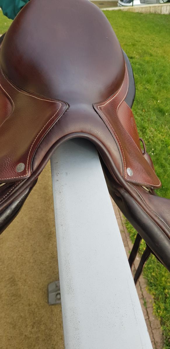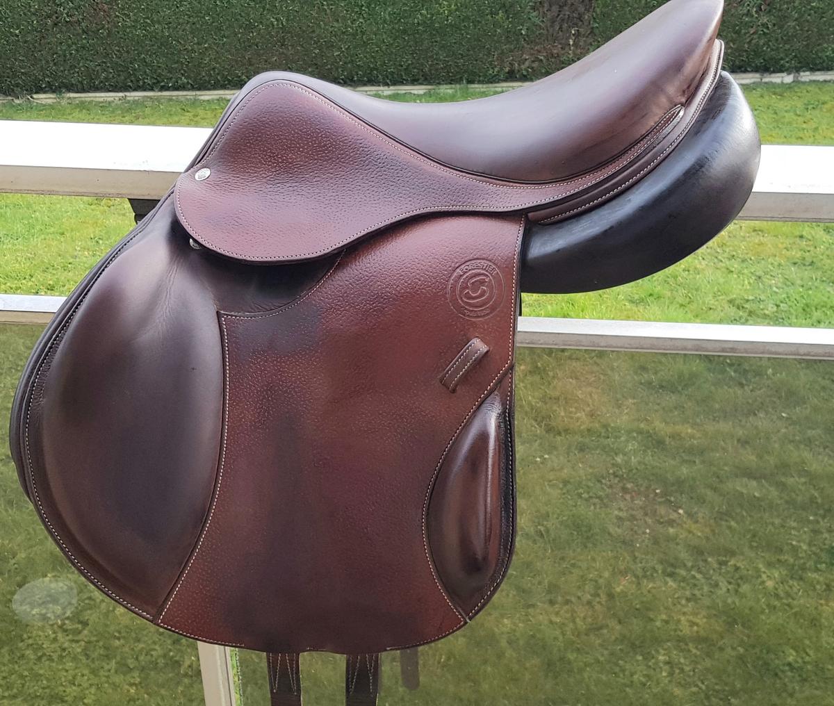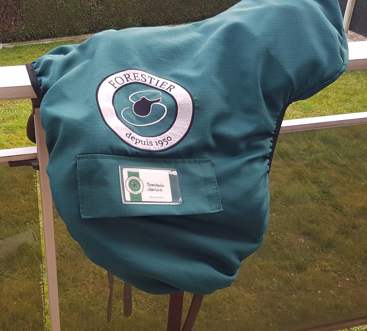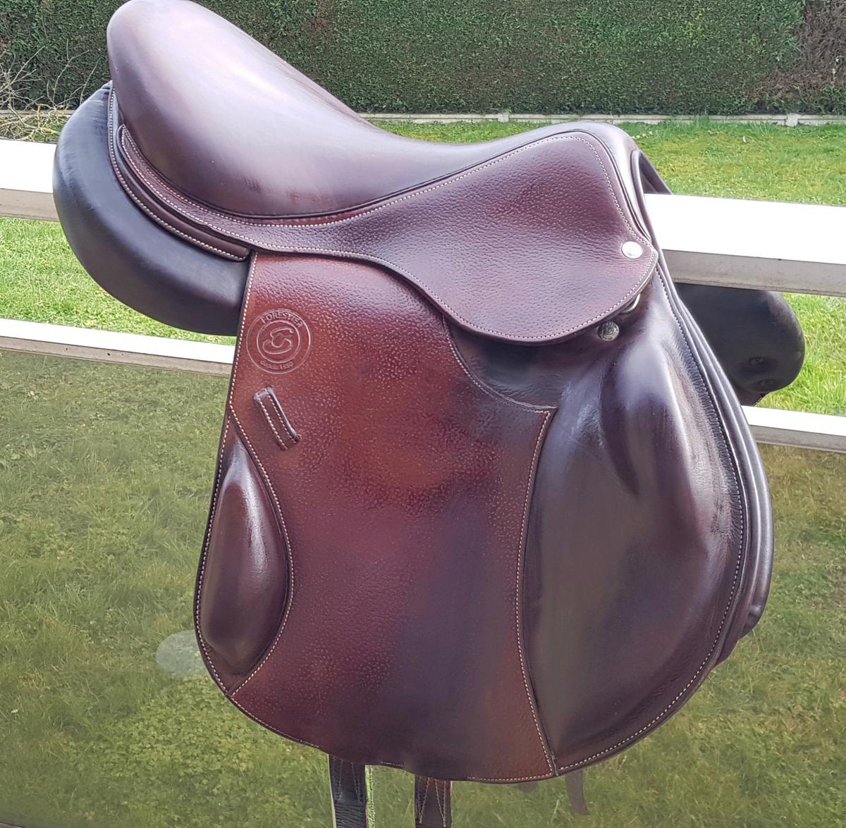 Je vends ma selle Forestier Boeckelo de 2020, en cuir grainé, châtaigne - 17 (2A), avec sa housse (Valeur neuve: 3790€).
